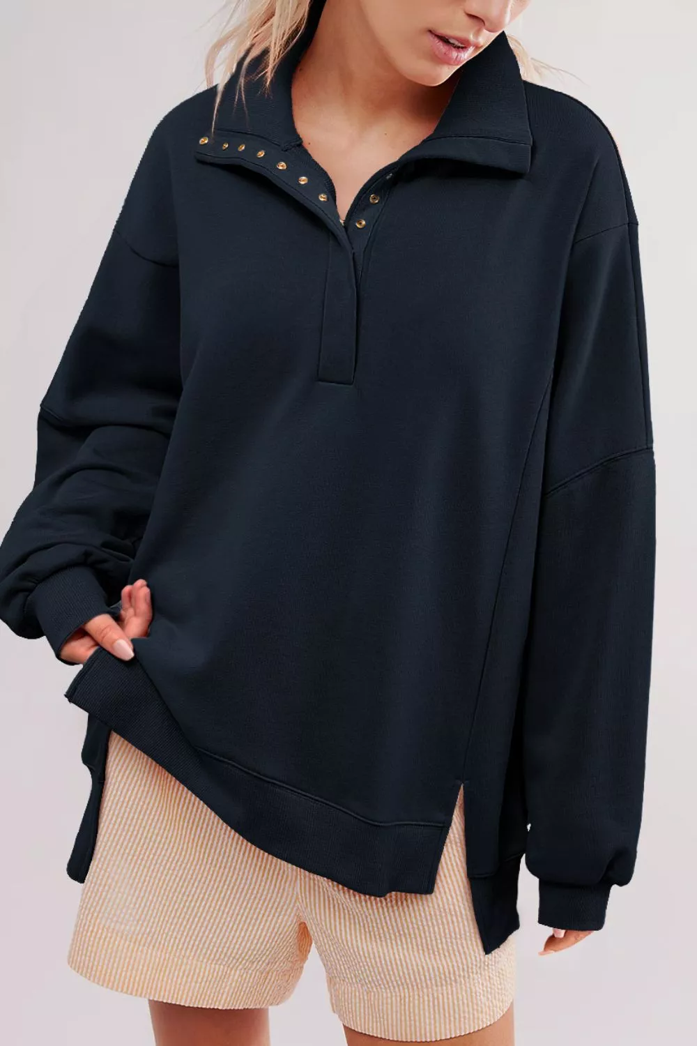 uttoned Collared Raw Detail High Low Baggy Sweatshirt with Slits