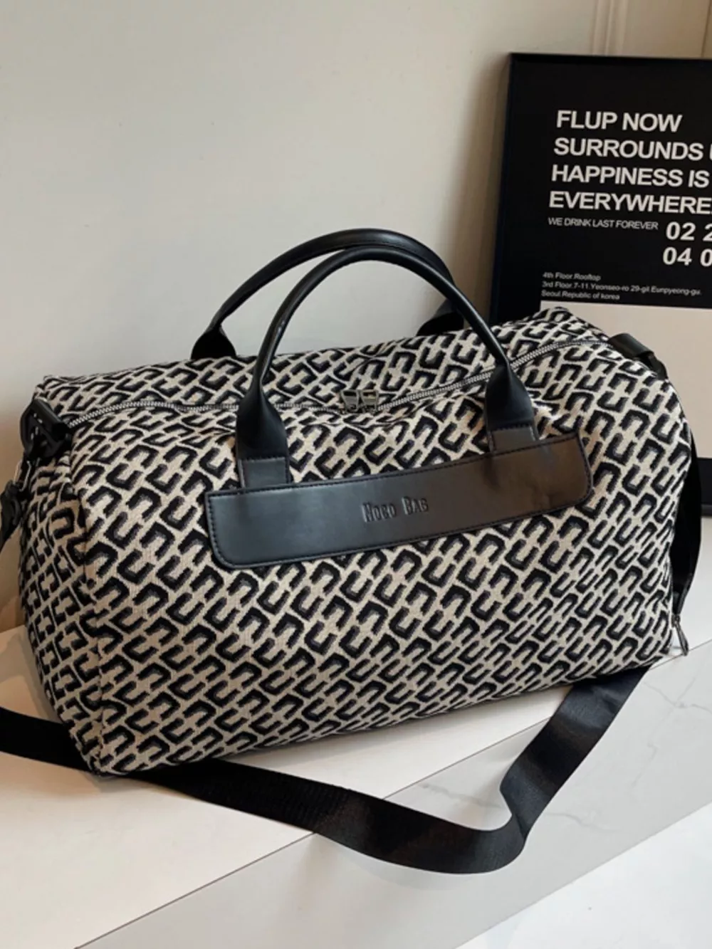 This stylish Geometric Pattern Travel Bag is perfect for your next adventure or gym visit. Made from durable materials, it features a spacious interior to hold all your essentials. The eye-catching geometric pattern adds a touch of style, while the comfortable shoulder strap and easy-to-carry handles make it convenient to transport. The secure zipper closure keeps your belongings safe and sound. Ideal for the Luggage & Travel Bag category, this bag combines fashion and function for the modern traveler. The bag is made of durable fabric with leather accents.