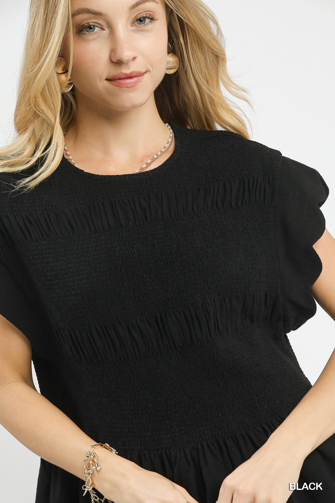This linen blend smocked peplum top features a round neckline and short scallop-edge sleeves for a feminine touch. The smocked detailing adds texture and interest to the blouse, while the ruffle peplum hem adds a flirty and stylish flair. Perfect for both casual and dressy occasions, this top is versatile and on-trend. Please note that it is not lined for a lightweight and breathable feel.