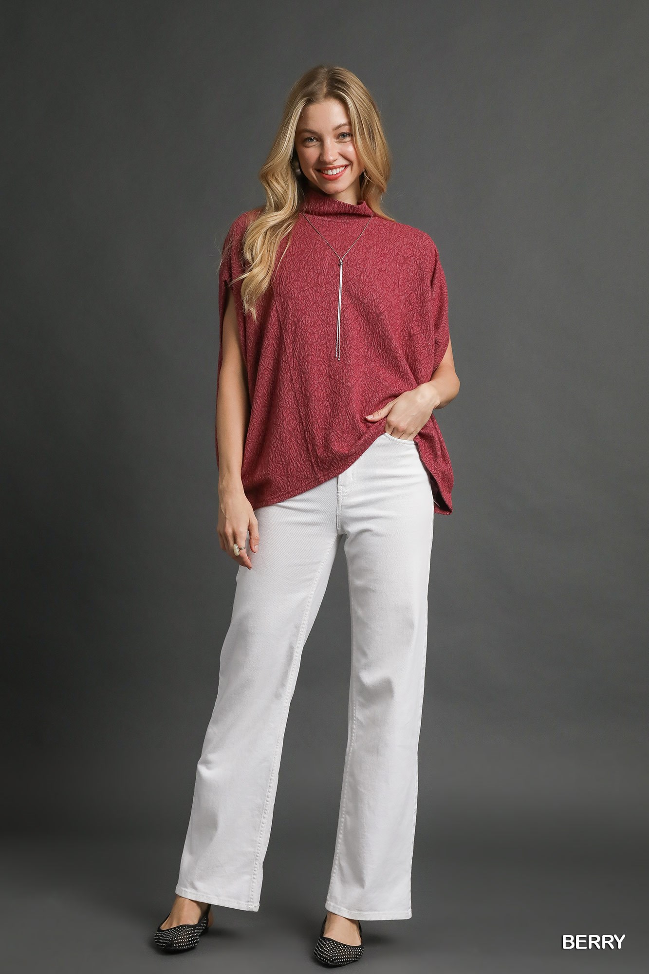 This textured mock neck relaxed top offers a cozy and stylish look with its fleece texture and mock neck design. The short dolman sleeves with side slits add a modern touch to the relaxed silhouette. The straight, easy-fit hemline provides a comfortable and effortless fit for everyday wear. Ideal for layering or wearing on its own, this top is versatile and easy to style. Please note that it is not lined, making it great for layering during cooler months.