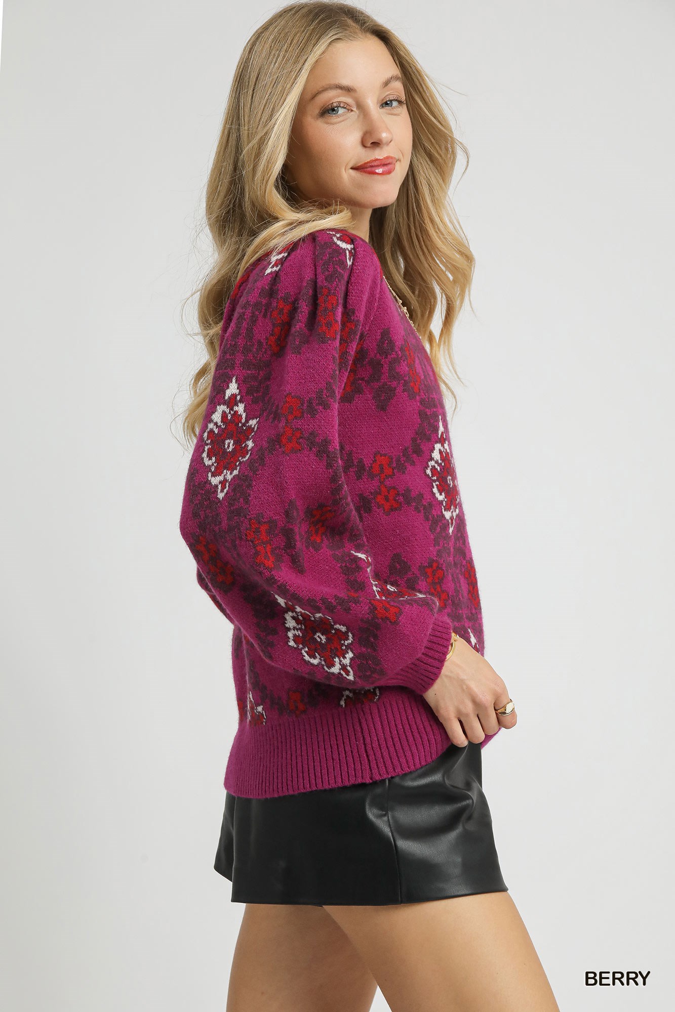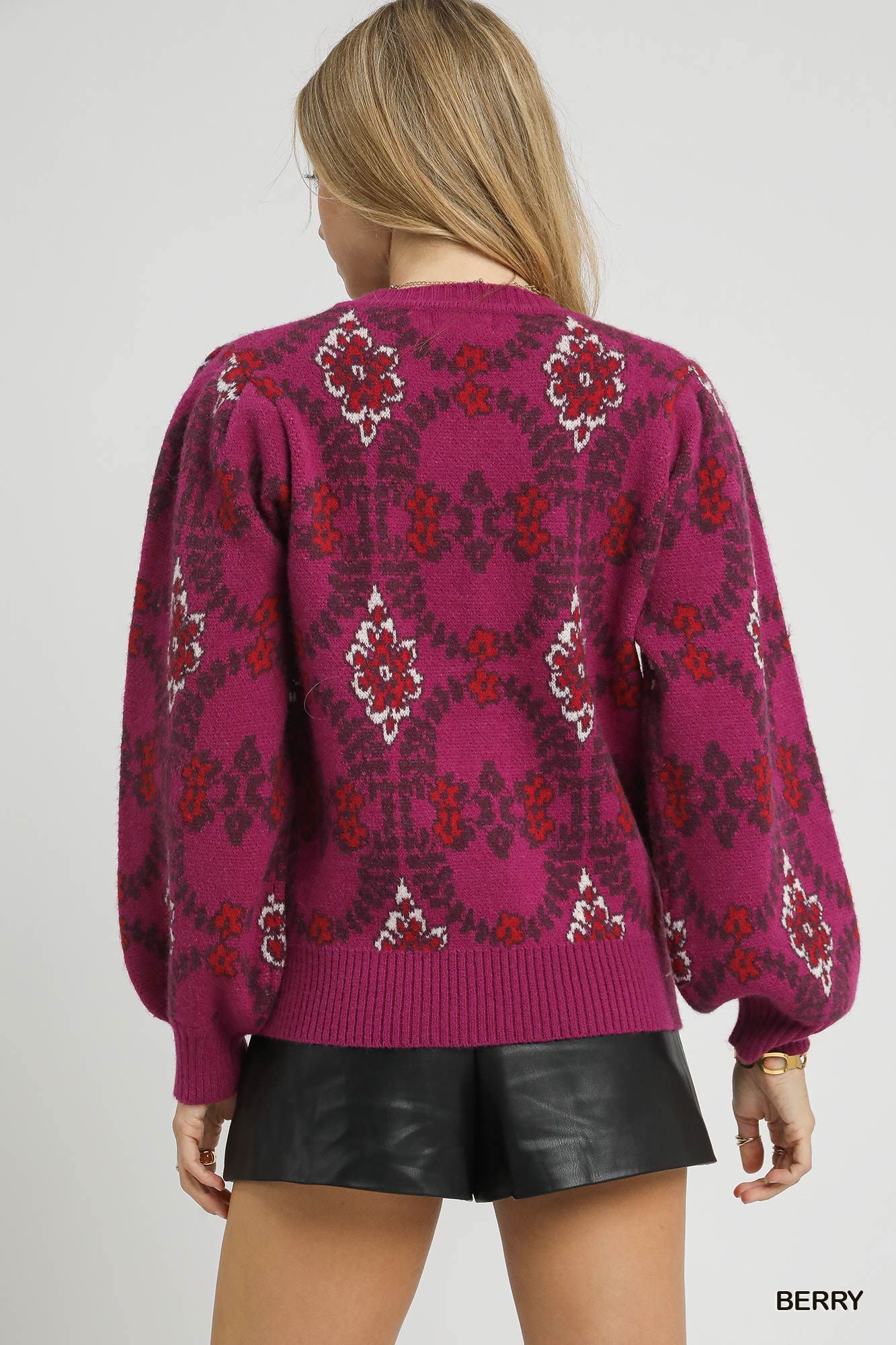 Stay cozy and stylish with this Boho Patterned Knit Sweater, featuring a unique Jacquard knit design for a statement look. The classic crew neck adds a timeless touch to this sweater, perfect for everyday wear. Long balloon sleeves add a trendy twist, while the ribbed hem provides a comfortable fit. This sweater is not lined, making it ideal for layering during colder days. Elevate your knitwear collection with this boho-inspired piece that combines warmth and fashion effortlessly.