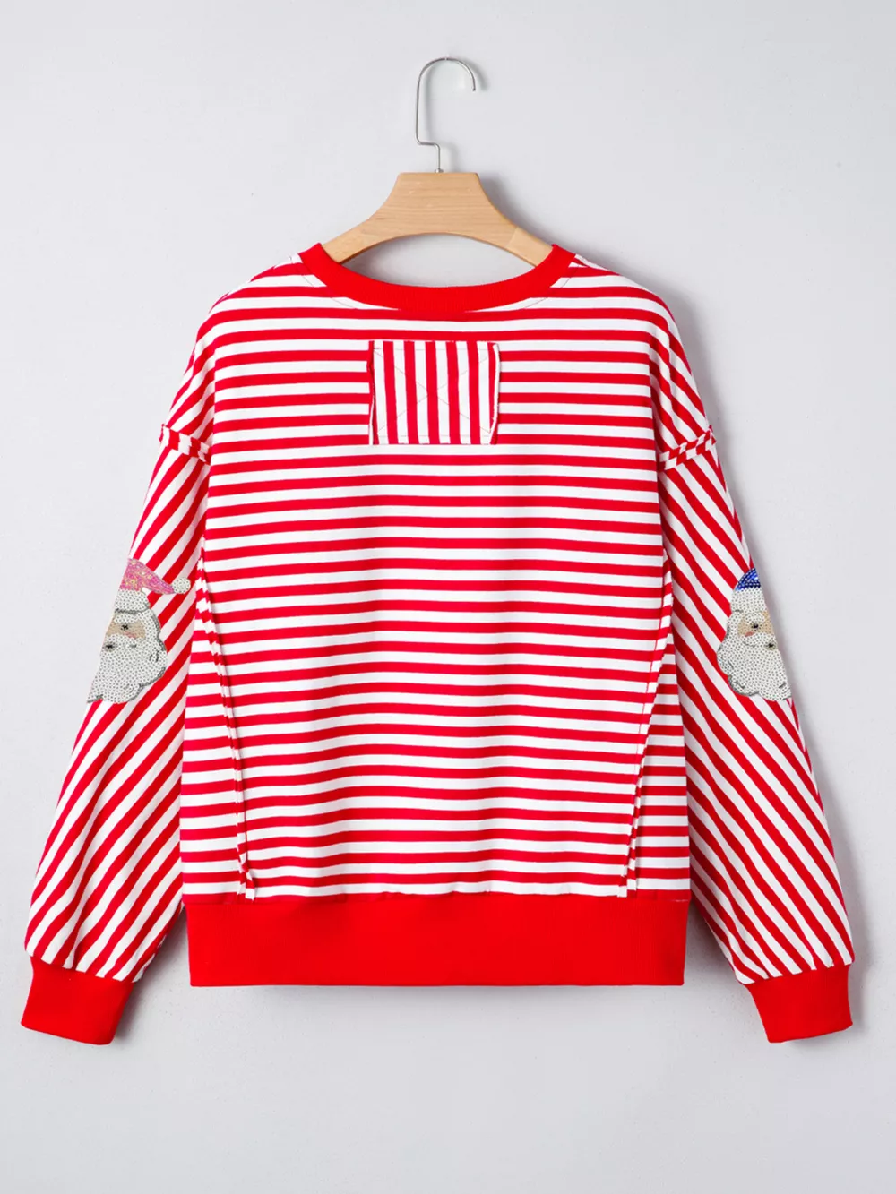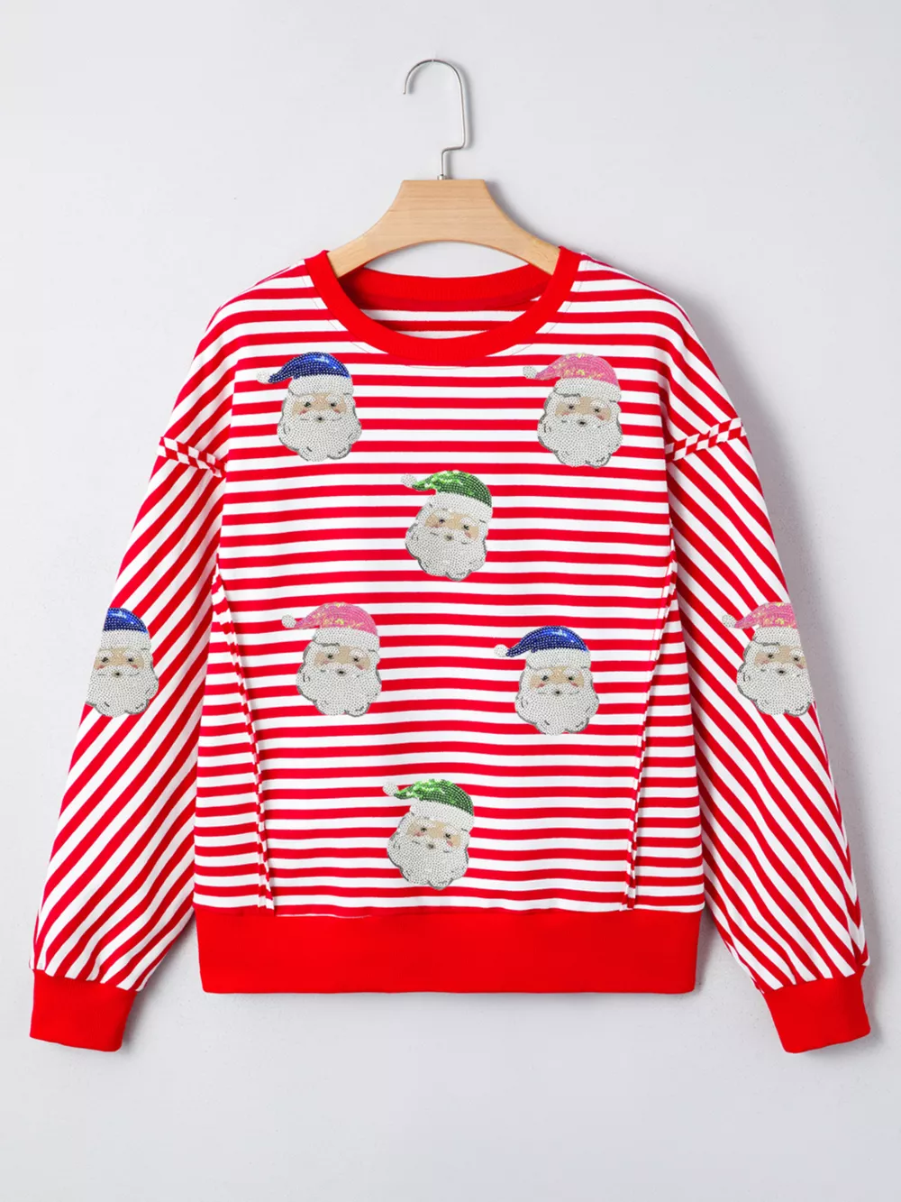 Stripe Sequin Santa Round Neck Raw Seam Detail Christmas Long Sleeve Top