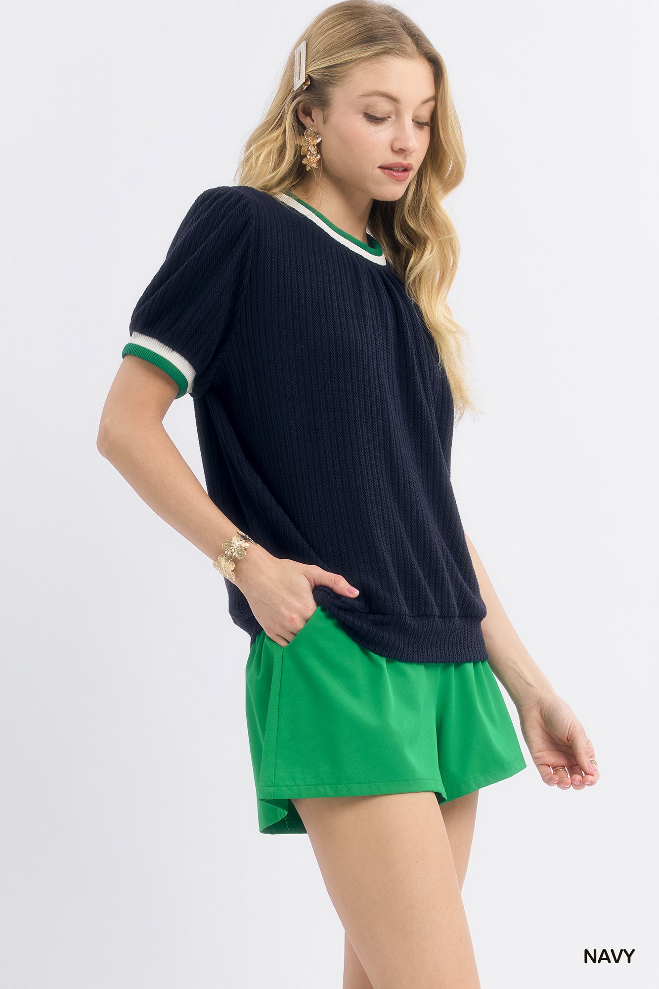Umgee Puff Sleeve Knit Top with Contrast Rib Trim