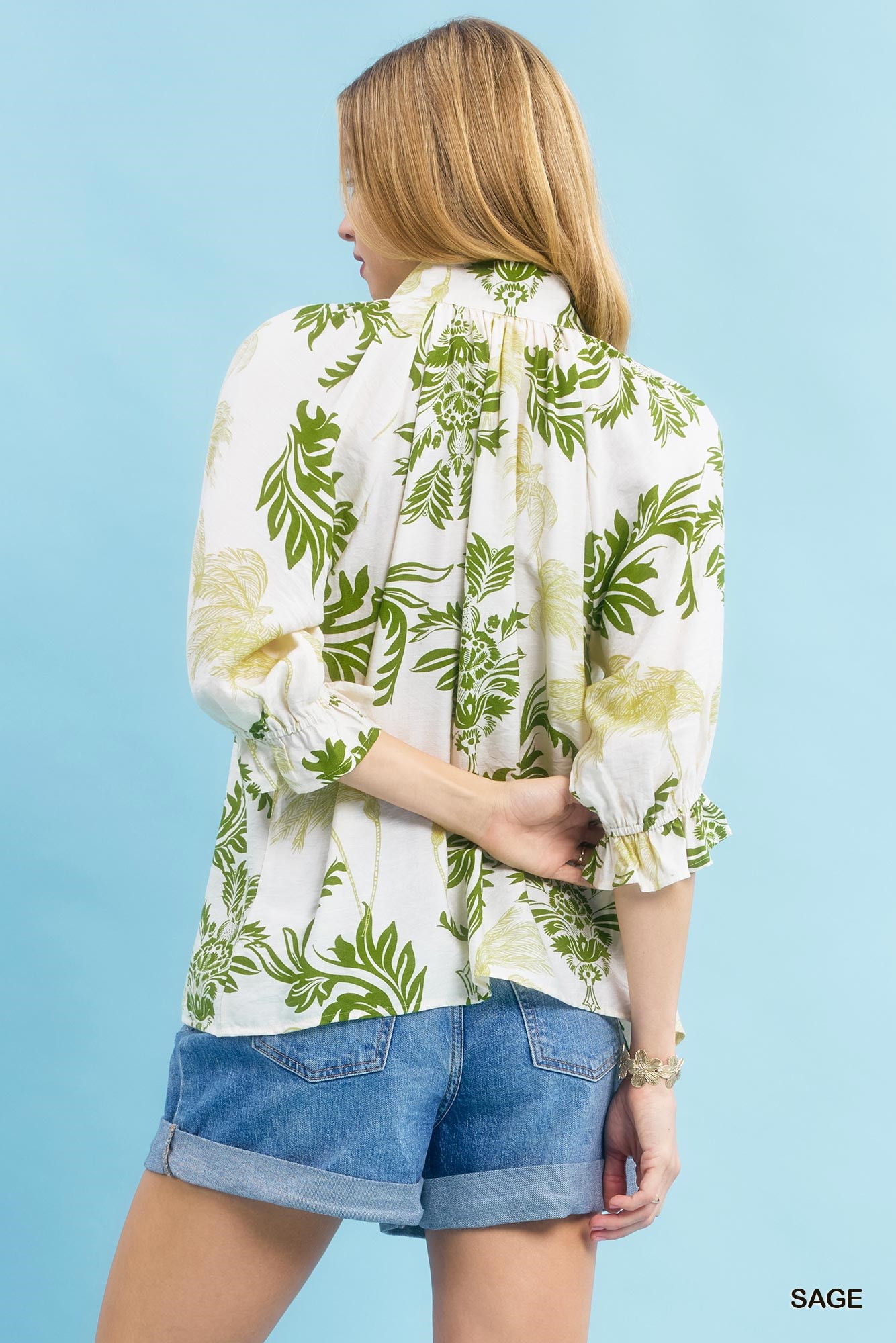 Umgee Leafy Damask Print Blouse with Contrast Scalloped Trim Detail