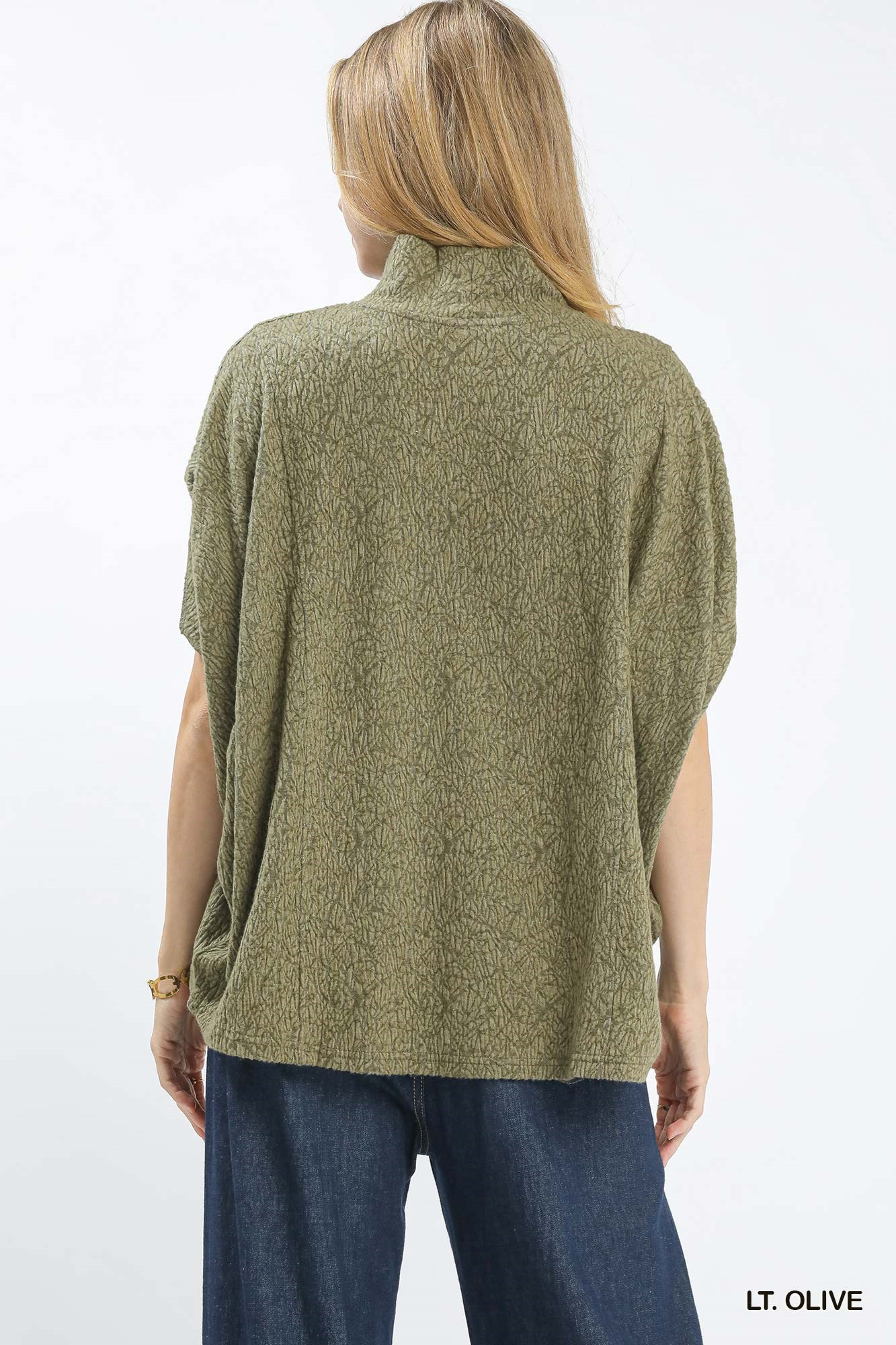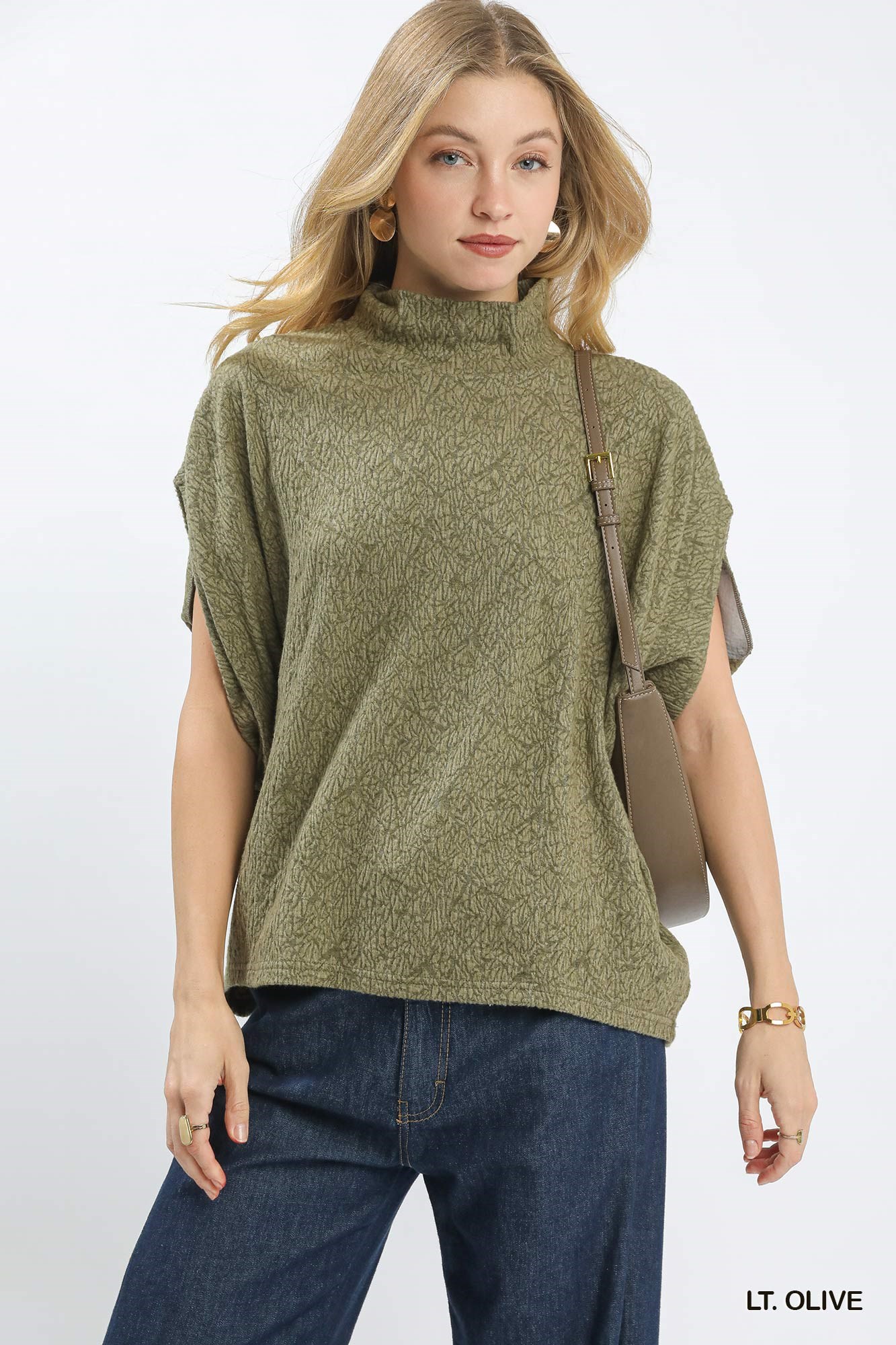 This textured mock neck relaxed top offers a cozy and stylish look with its fleece texture and mock neck design. The short dolman sleeves with side slits add a modern touch to the relaxed silhouette. The straight, easy-fit hemline provides a comfortable and effortless fit for everyday wear. Ideal for layering or wearing on its own, this top is versatile and easy to style. Please note that it is not lined, making it great for layering during cooler months.