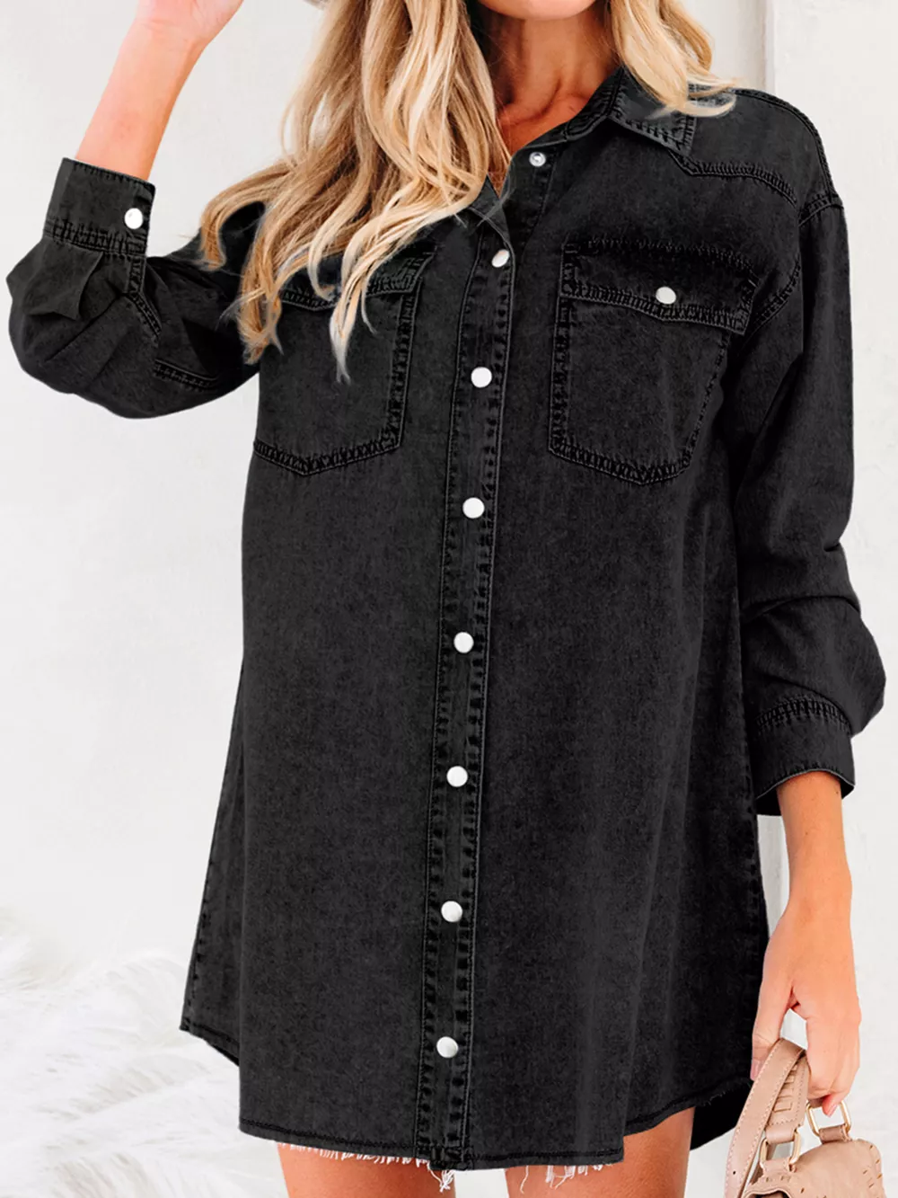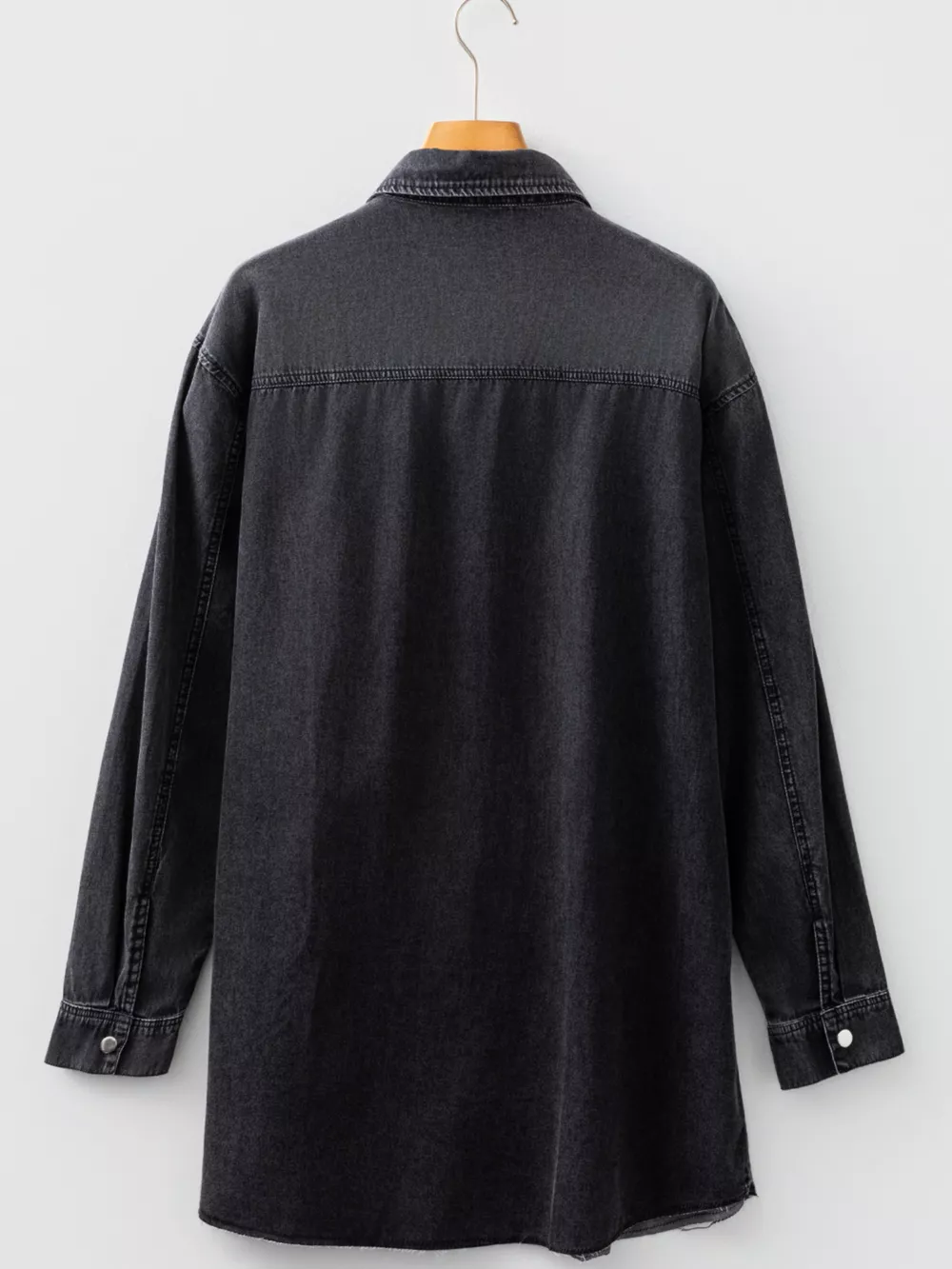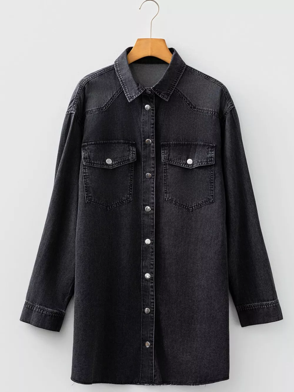 Chest Pocket Raw Hem Denim Loose Shirt Dress