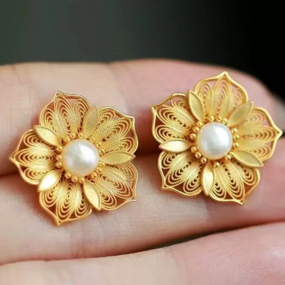 Floral Stud Earrings with Pearl Center