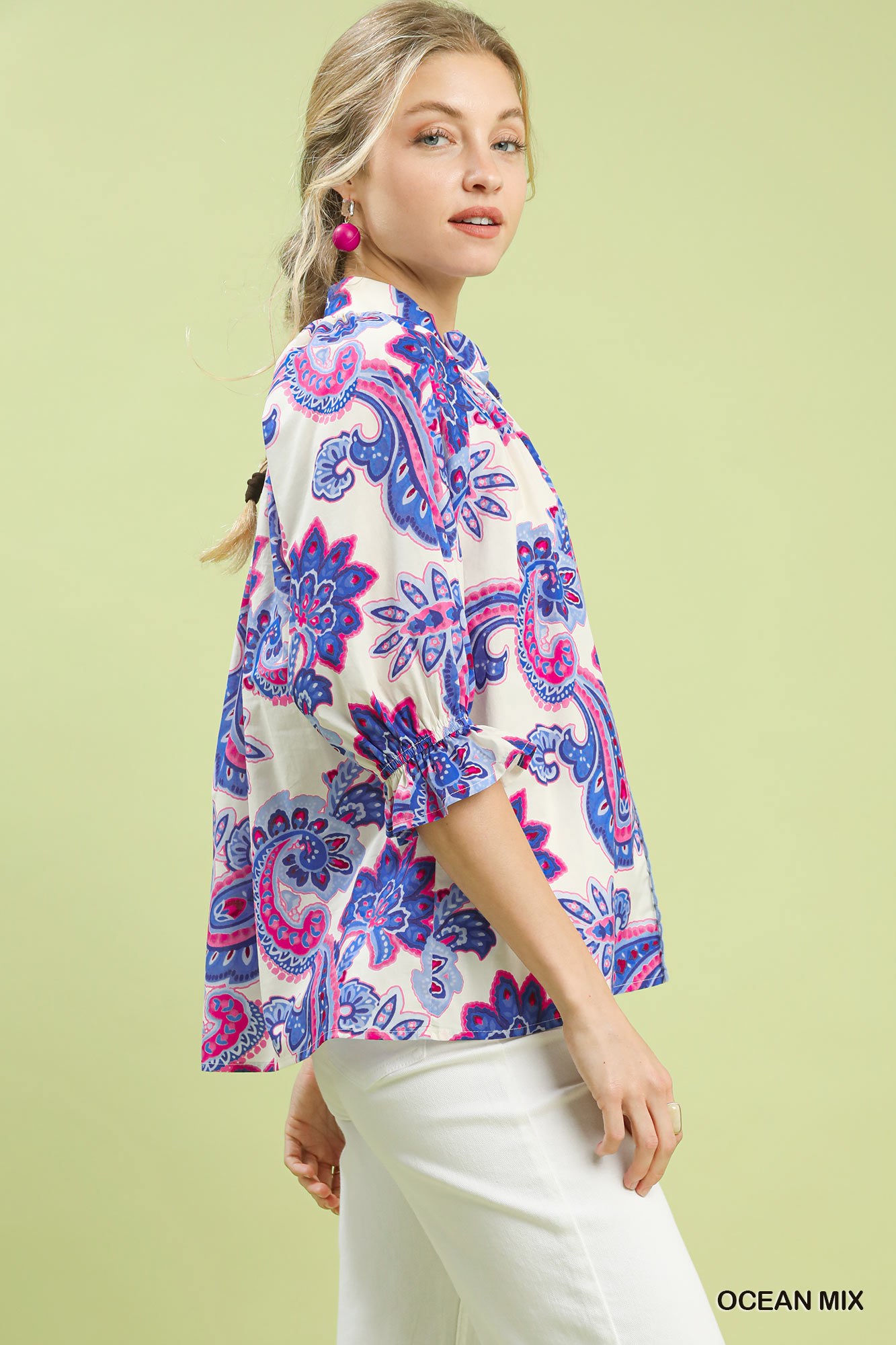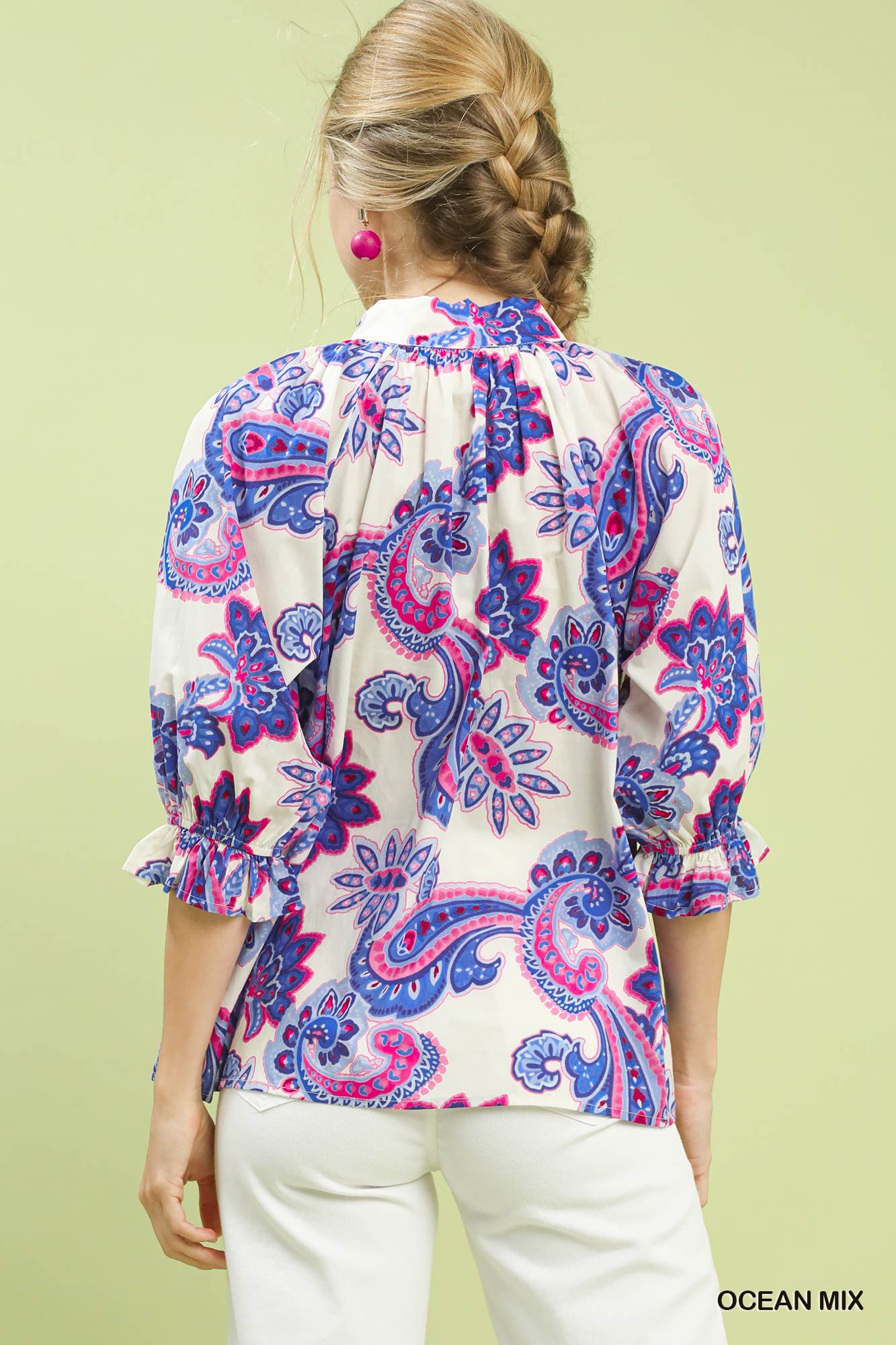 Umgee Paisley Print Button Front Blouse with Scallop Trim Detail