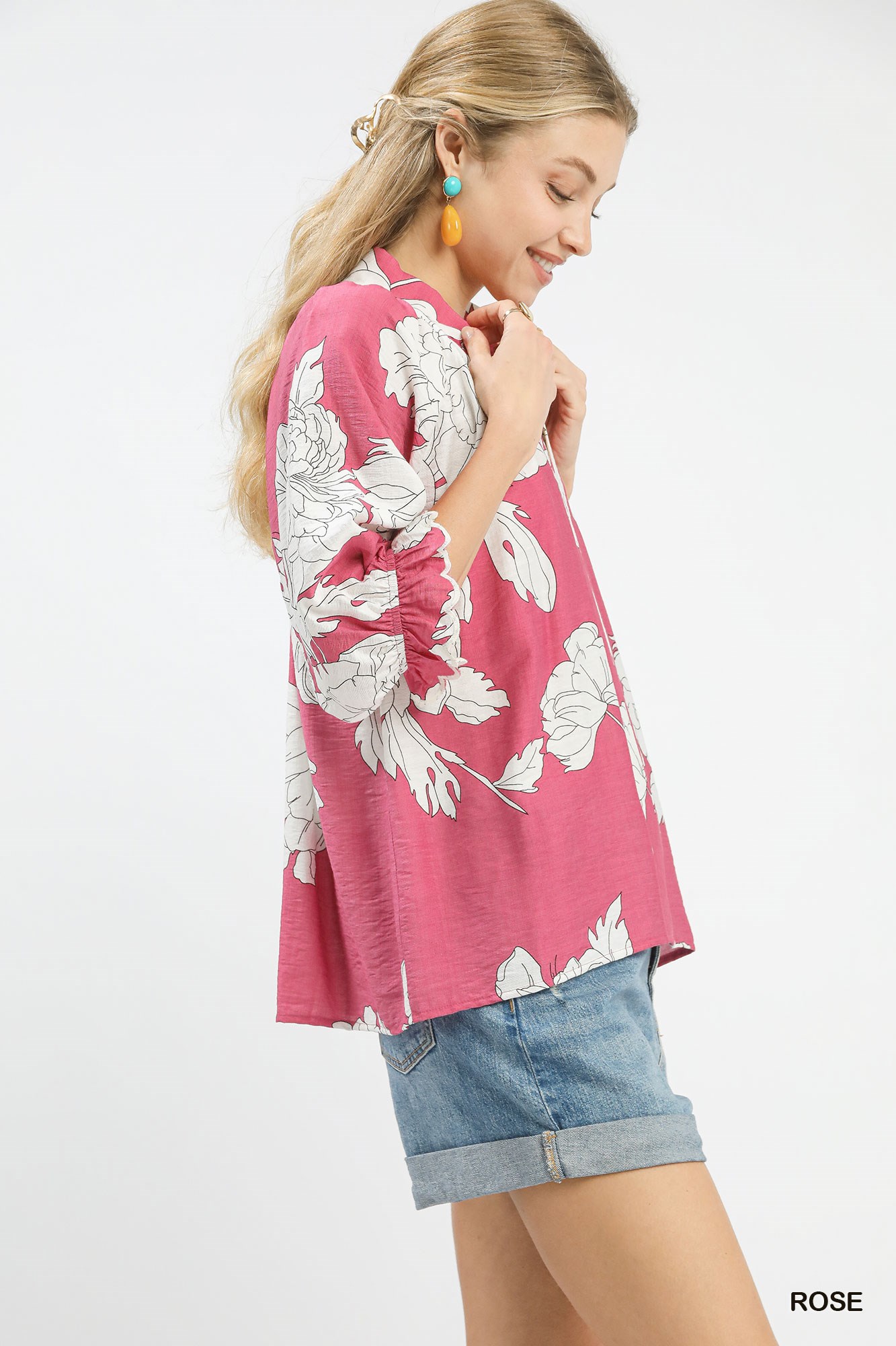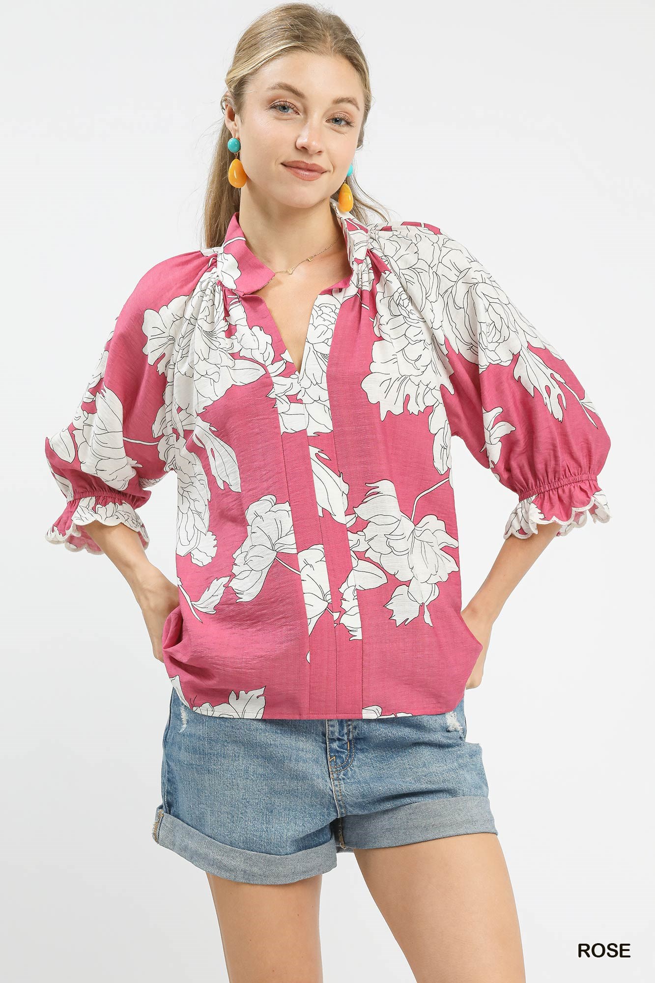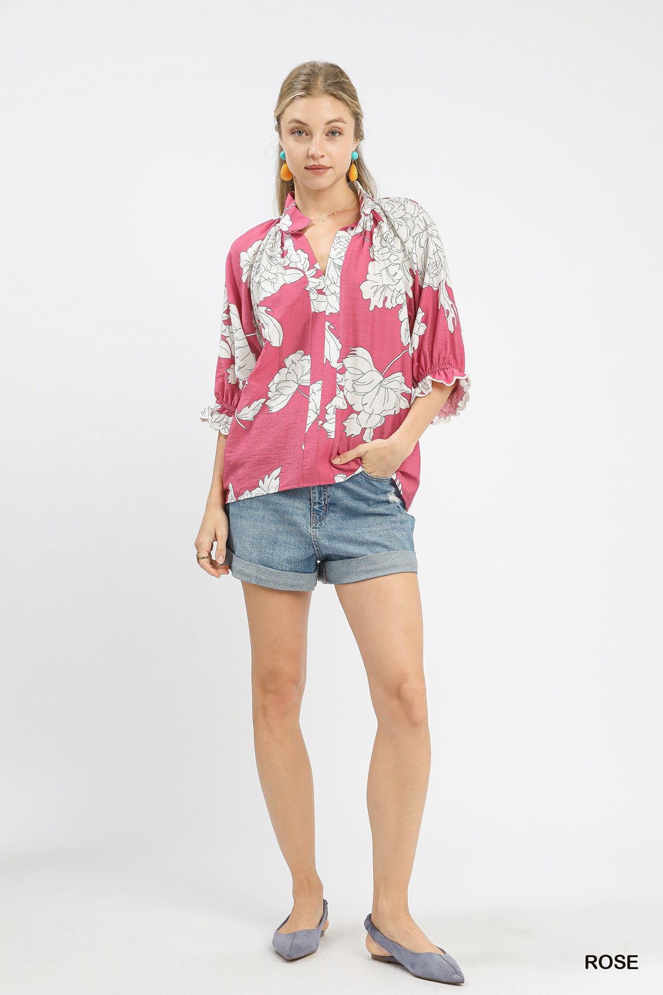 Umgee Peony Illustration Print Flounce Sleeve Blouse