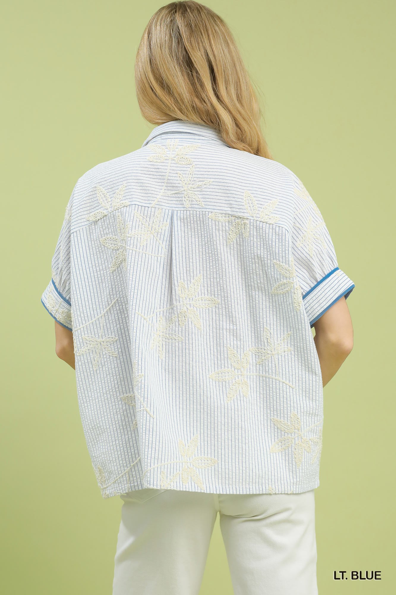 Umgee Striped Embroidered Blouse with Scallop Trim