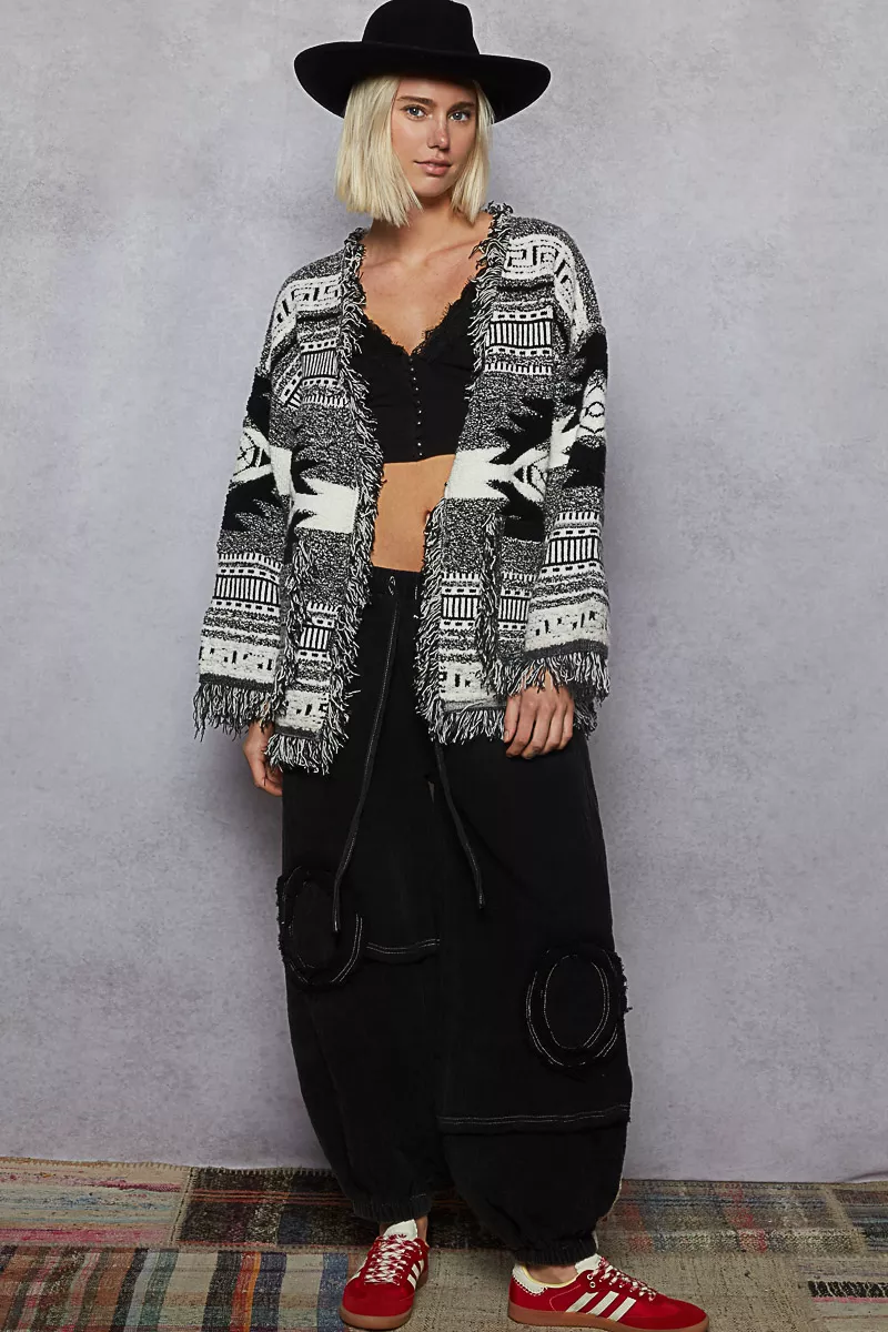 POL Open Front Geometric Print Cardigan with Fringe Detail