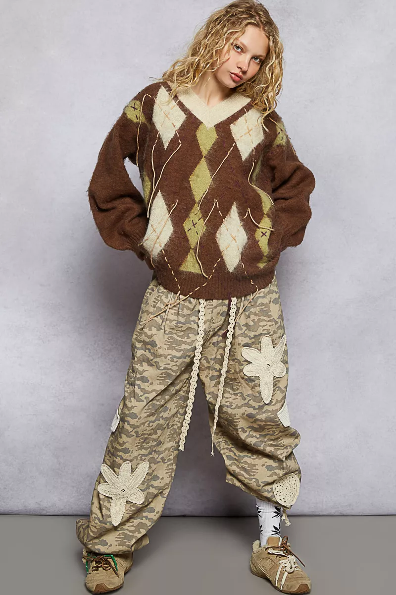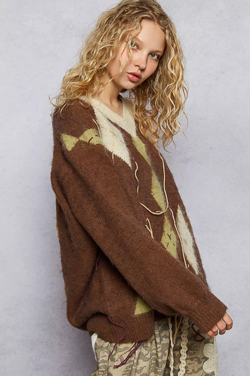 POL V-Neck Argyle Pattern Mohair Sweater with Contrast Exposed Stitch Detail