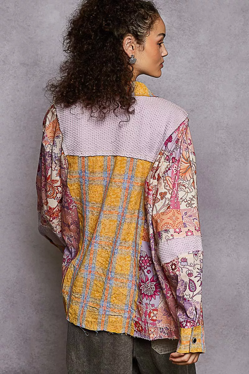 POL Printed Button Down Long Sleeve Exposed Seam Shirt