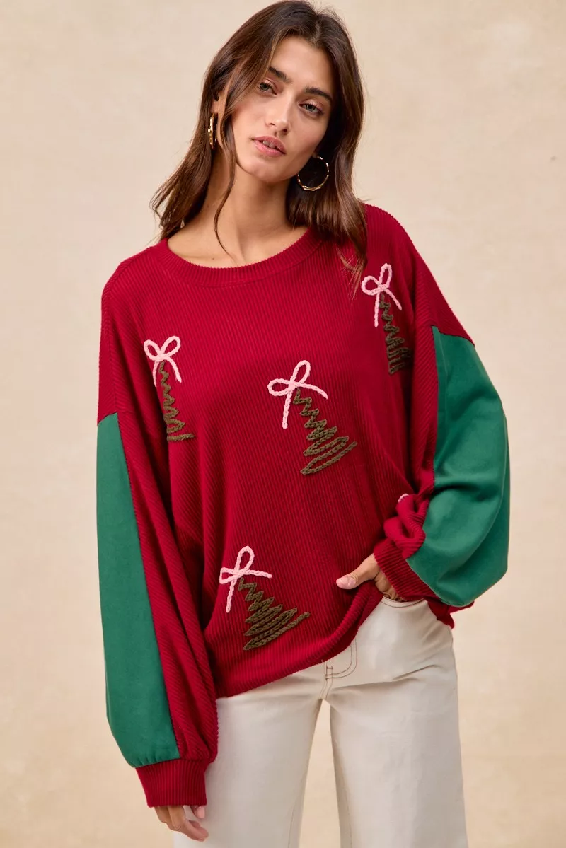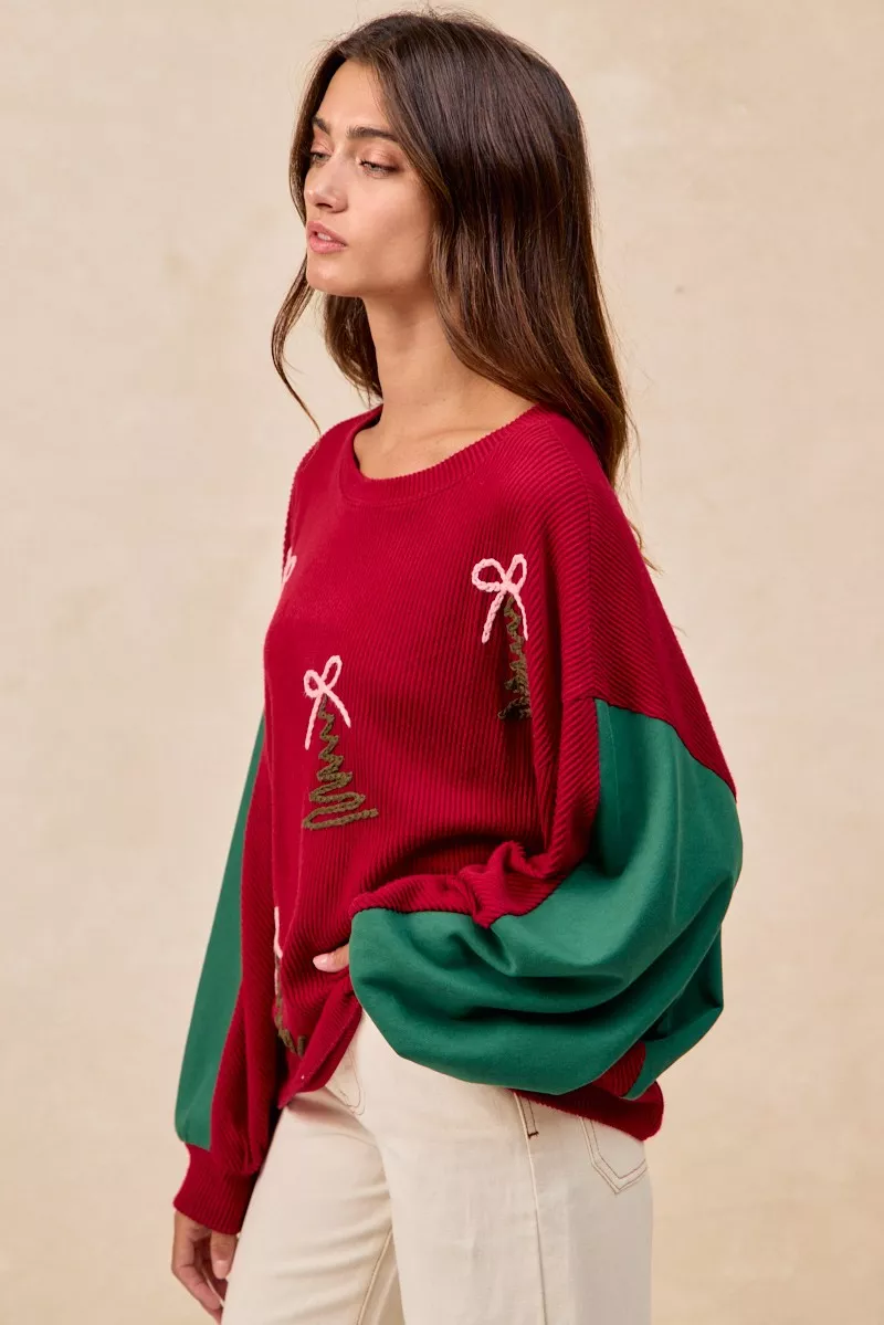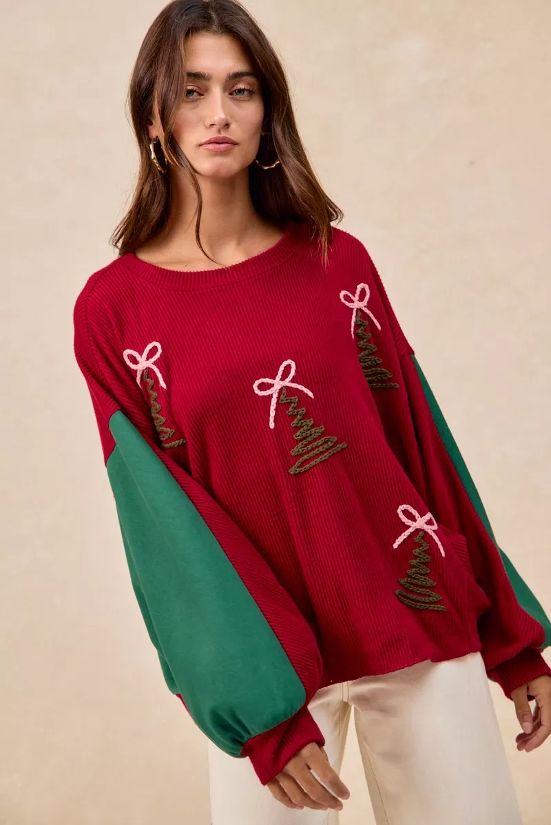This Christmas-themed sweater top features a beautifully embroidered tree design, perfect for spreading holiday cheer. The intricate details on the sweater make it a festive and stylish choice for any winter gathering. With its cozy knit fabric, this sweater is both comfortable and fashionable for the season. The embroidered tree adds a touch of elegance and whimsy to your winter wardrobe. Embrace the spirit of the holidays with this charming sweater top.