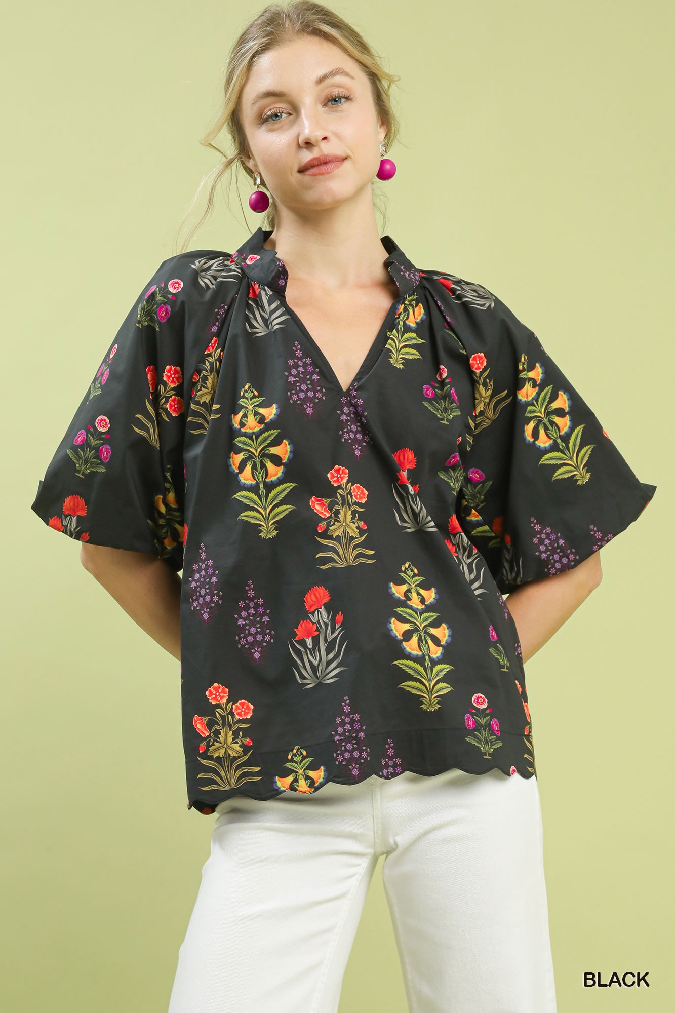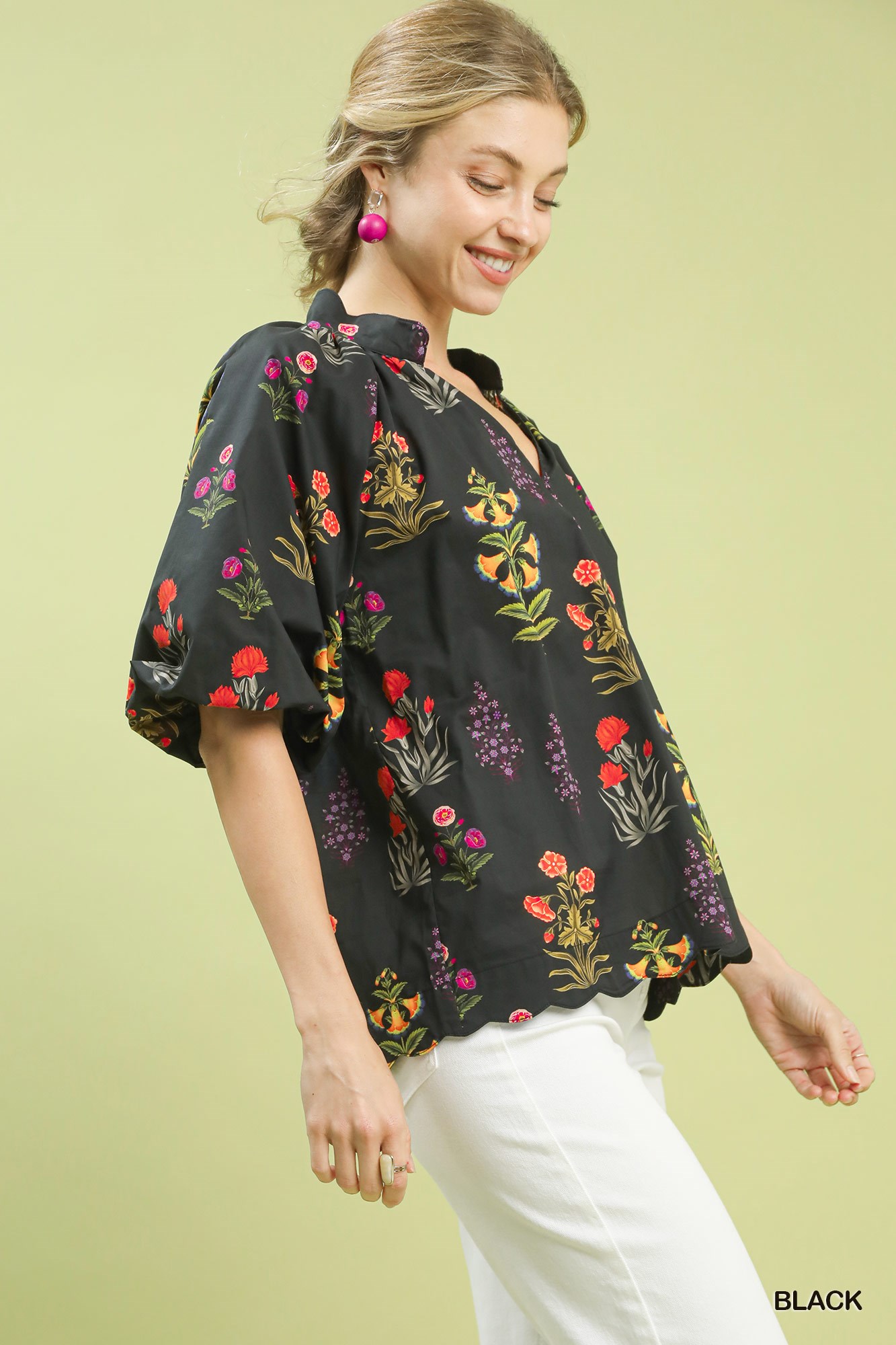Umgee Floral Print Puff Sleeve Scallop Hem Blouse