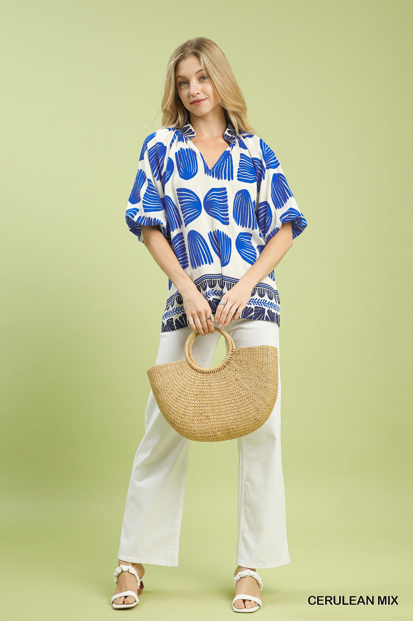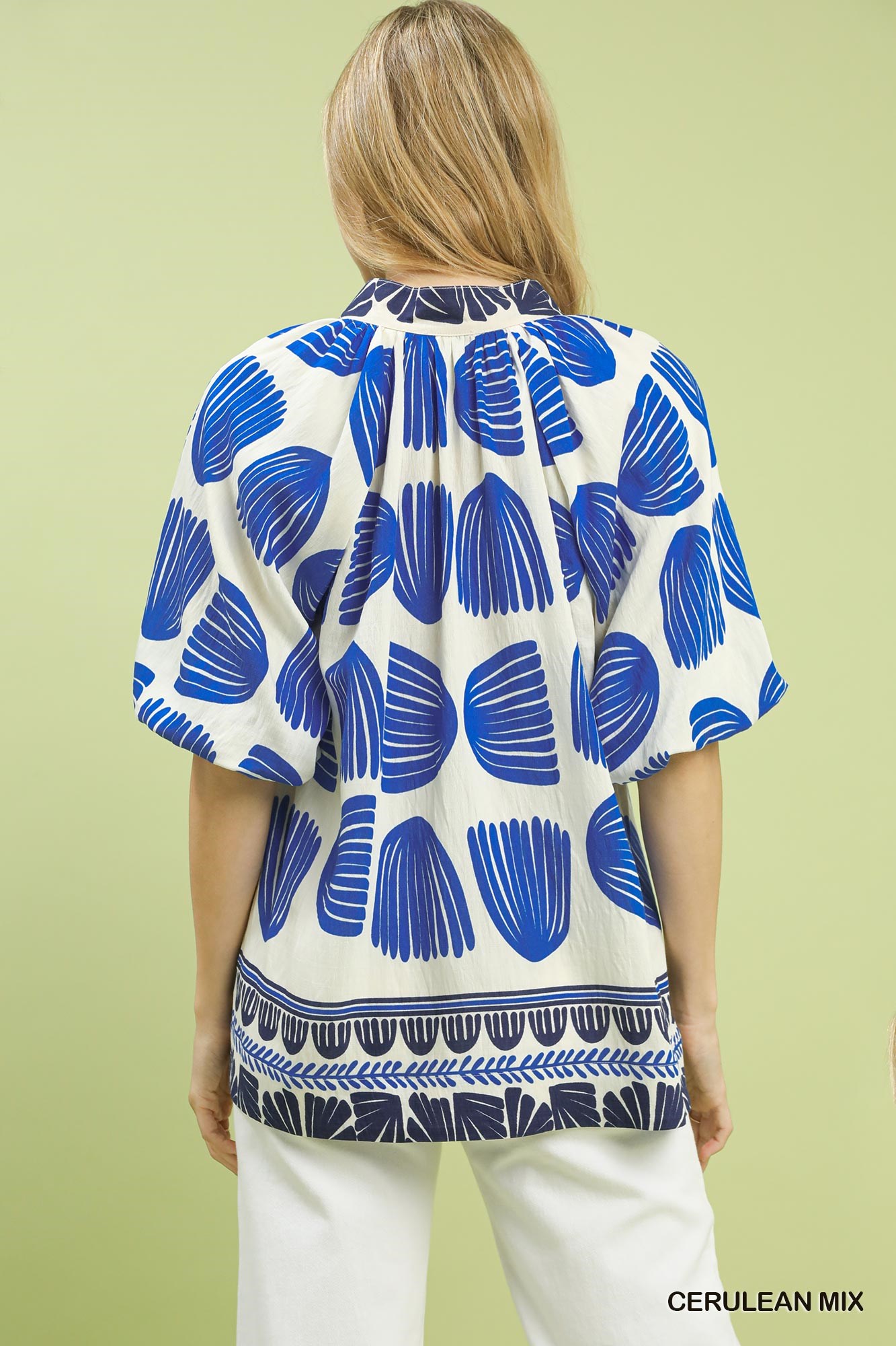 Umgee Shell Block Border Print Puff Sleeve Blouse