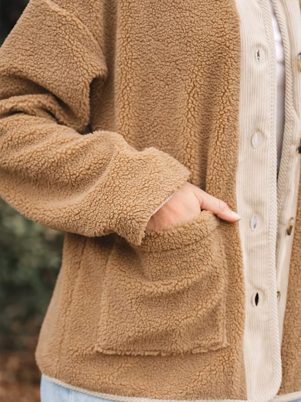 Puffy Plush Corduroy Edge Patchwork Jacket with Pockets