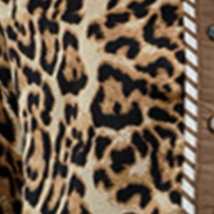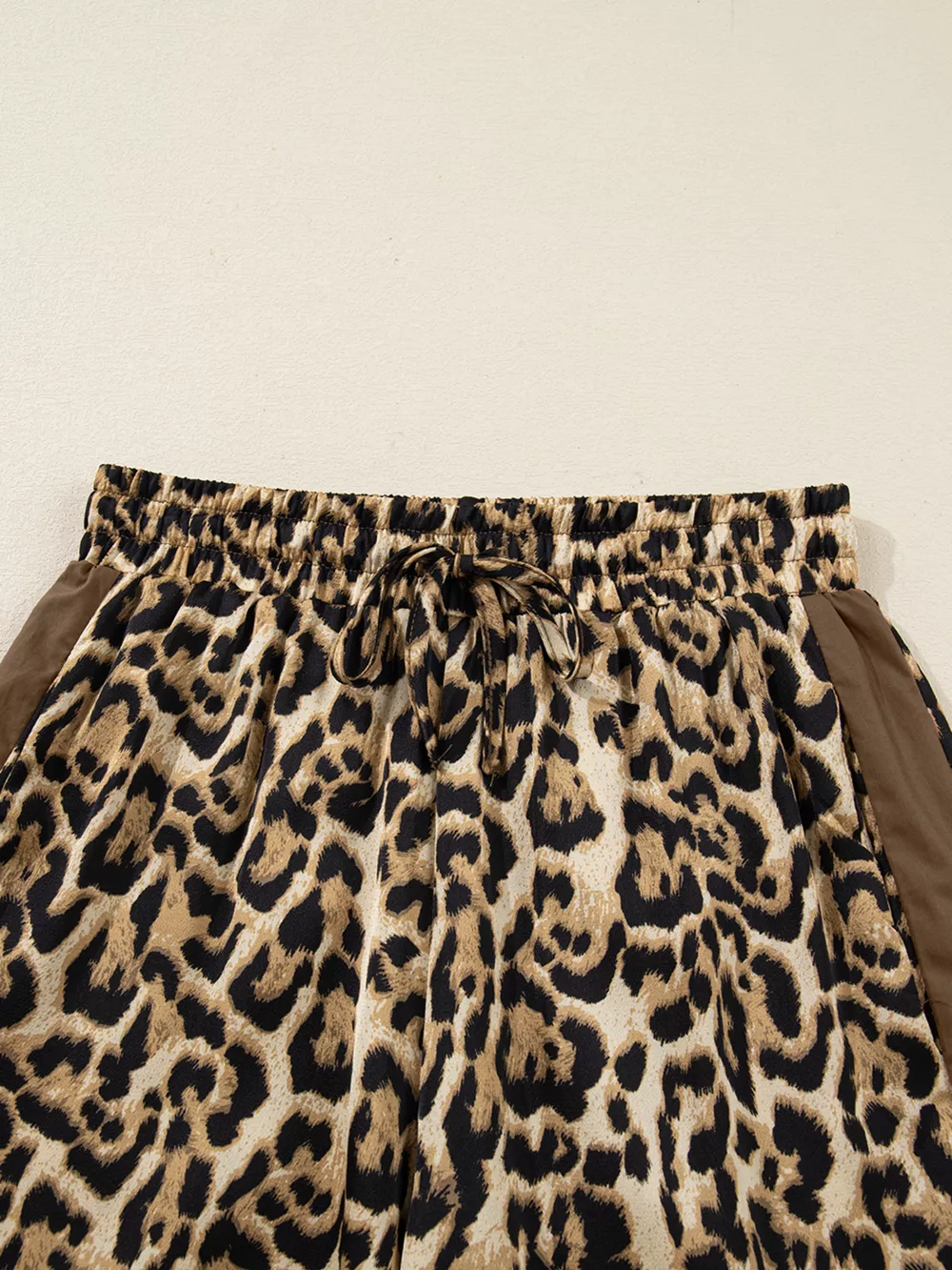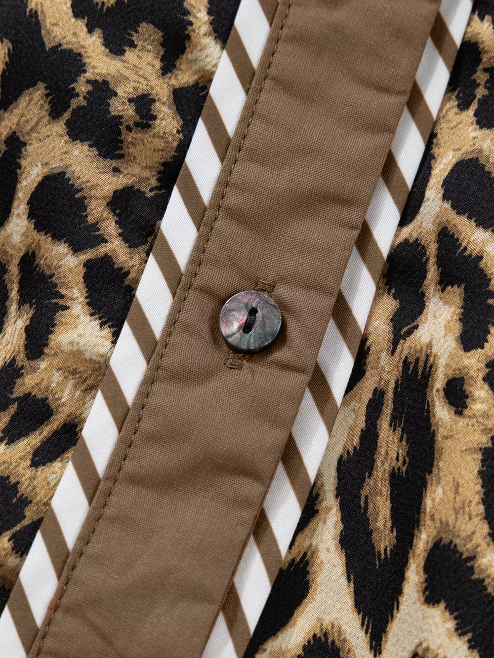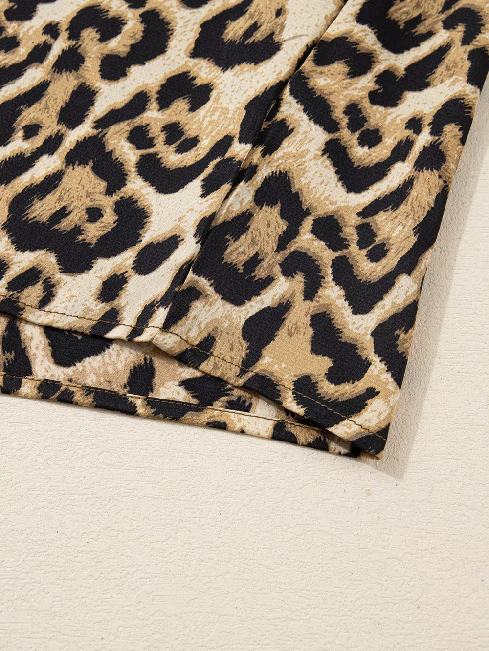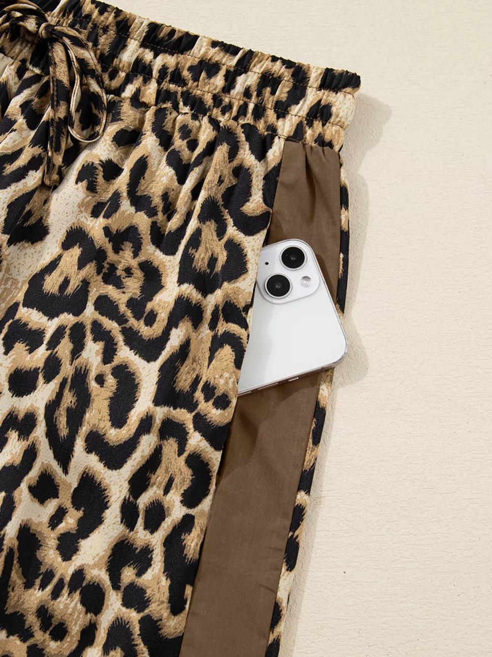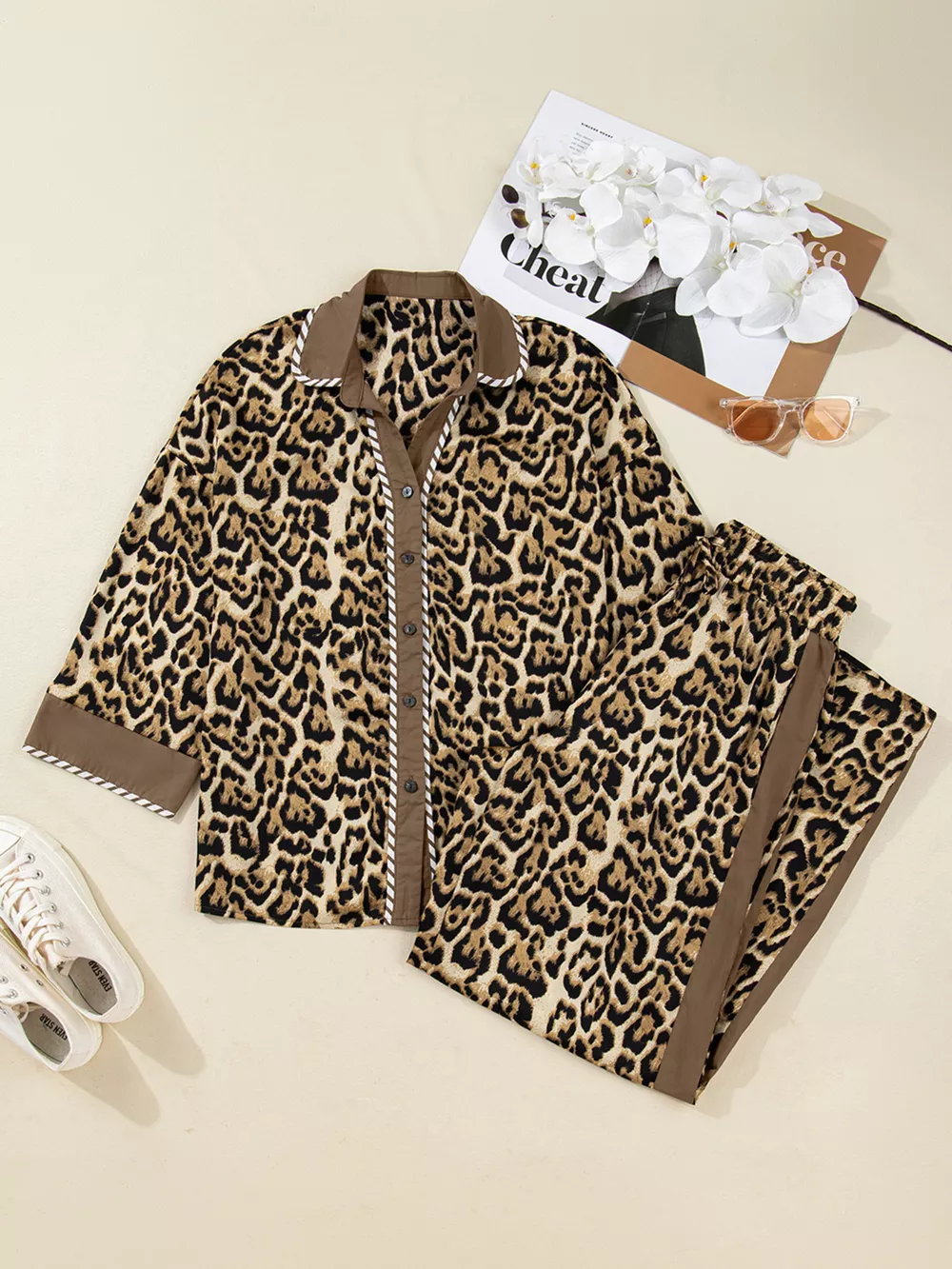 Leopard Collared 3/4 Sleeve Shirt and Loose Pants Two Piece Outfit Set