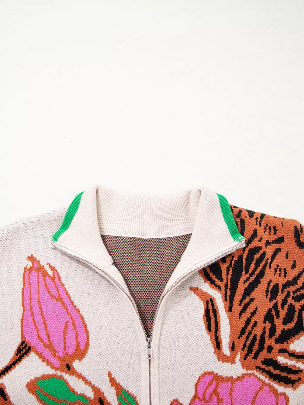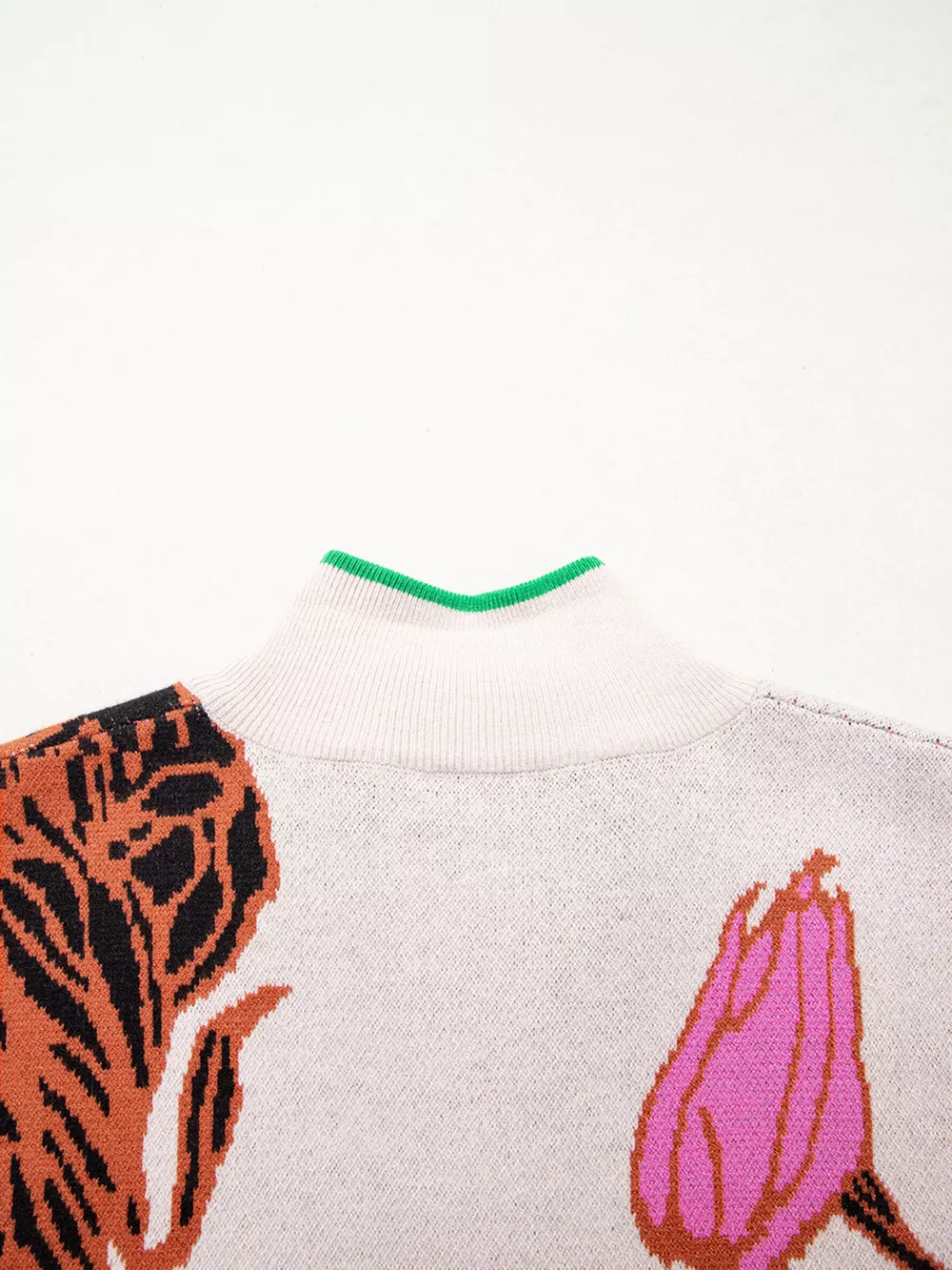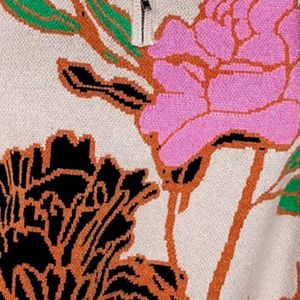 Floral Pattern Knit Quarter Zip Stand Neck Sweater