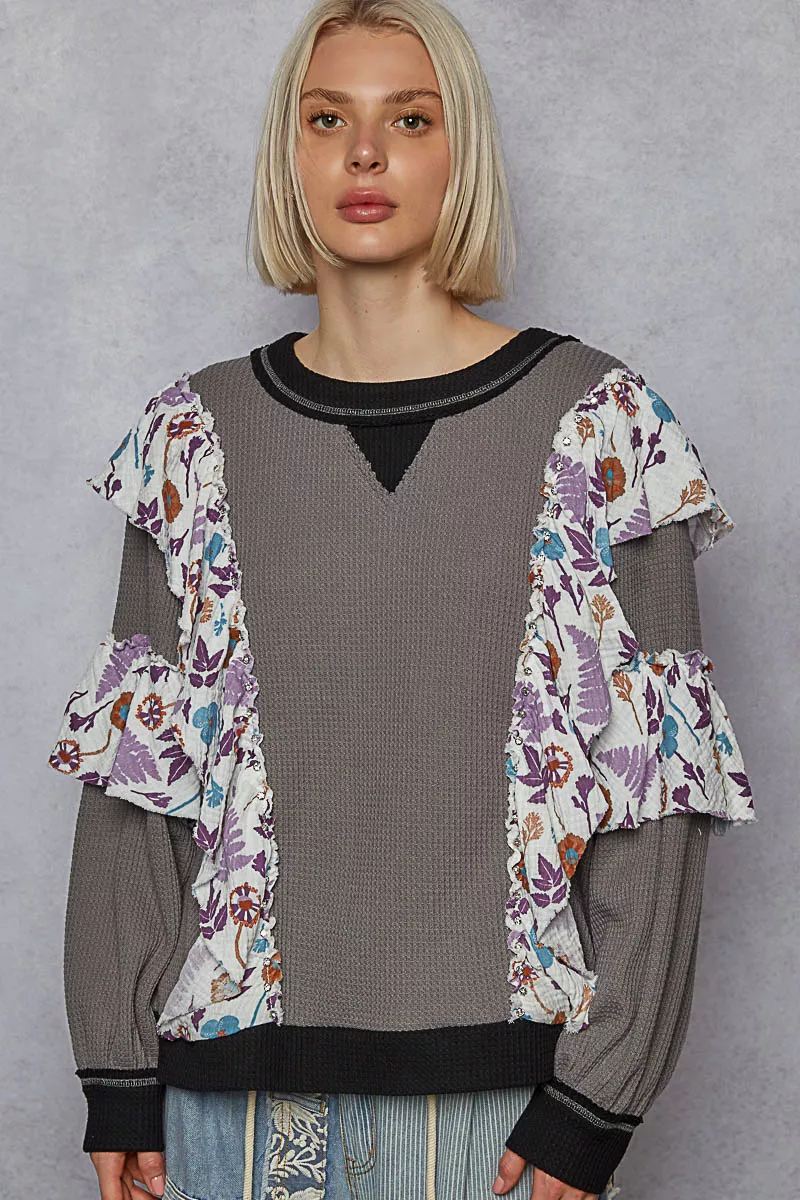 POL Round Neck Sweater with Floral Ruffle Detail