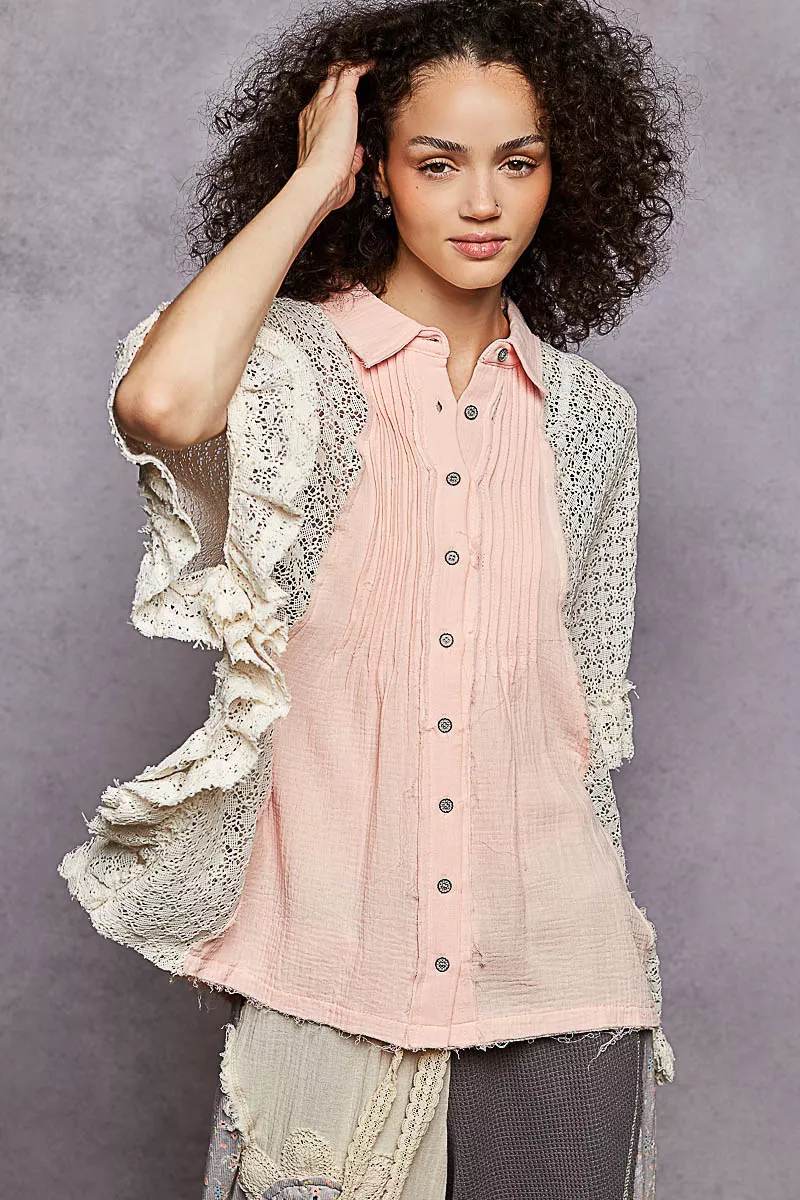 POL Button Down Front Pleated Shirt with Crochet Patch