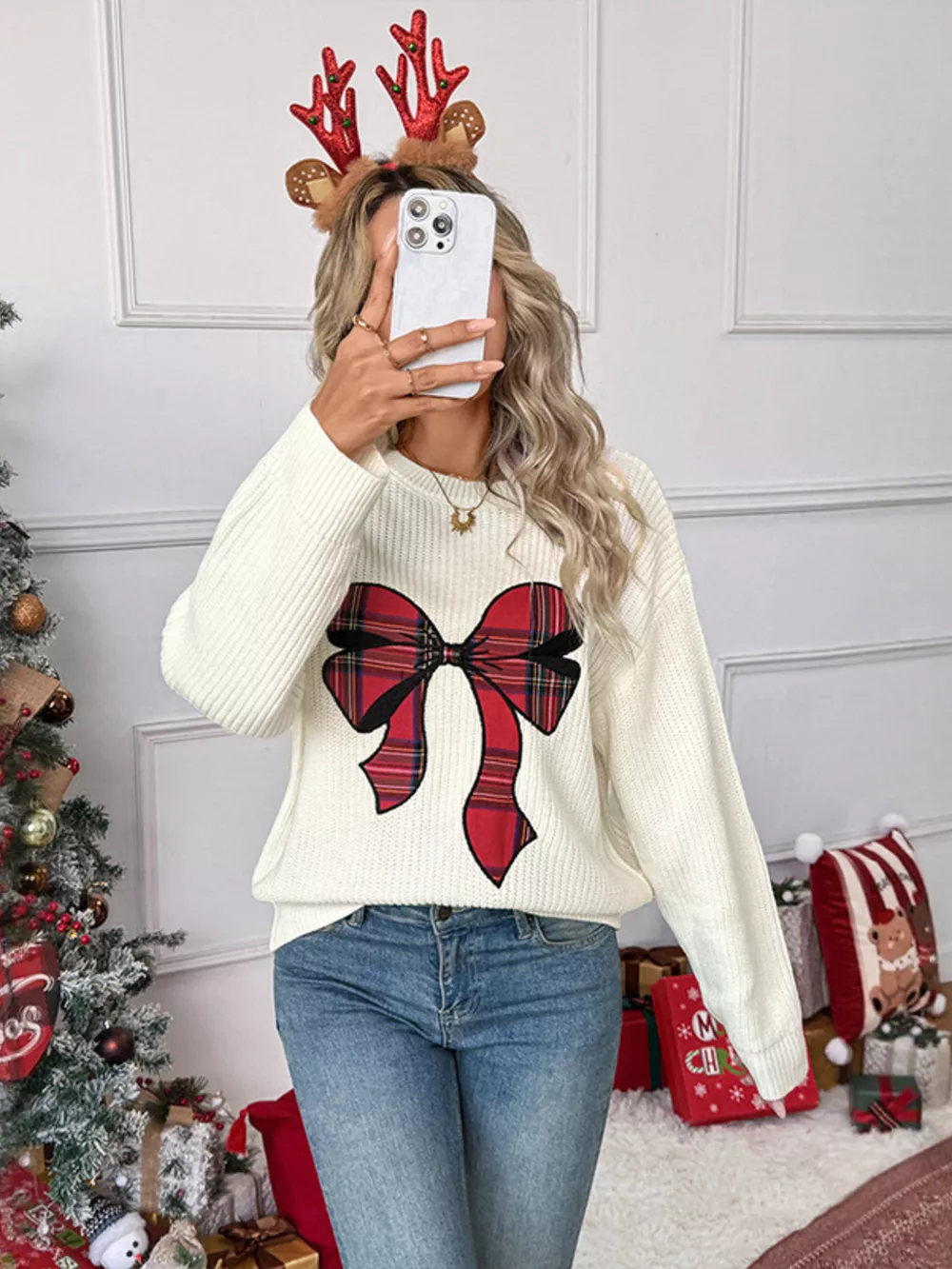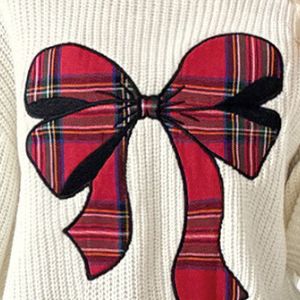 Plaid Bow Round Neck Sweater