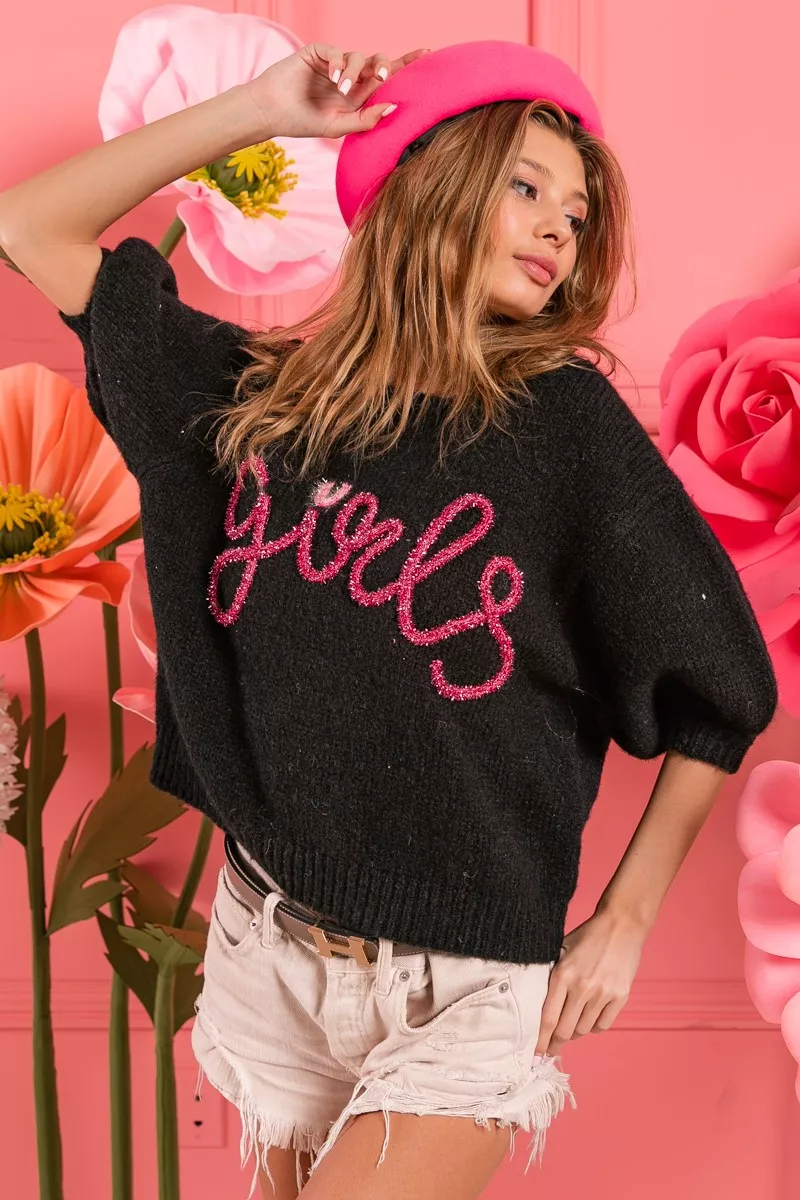 BiBi Metallic Letter Short Puff Sleeve Hairy Sweater