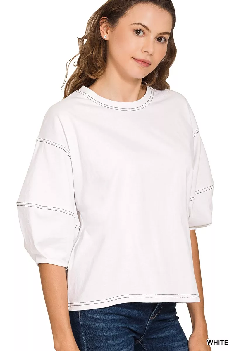 Zenana Balloon Sleeve Top with Contrast Stitching
