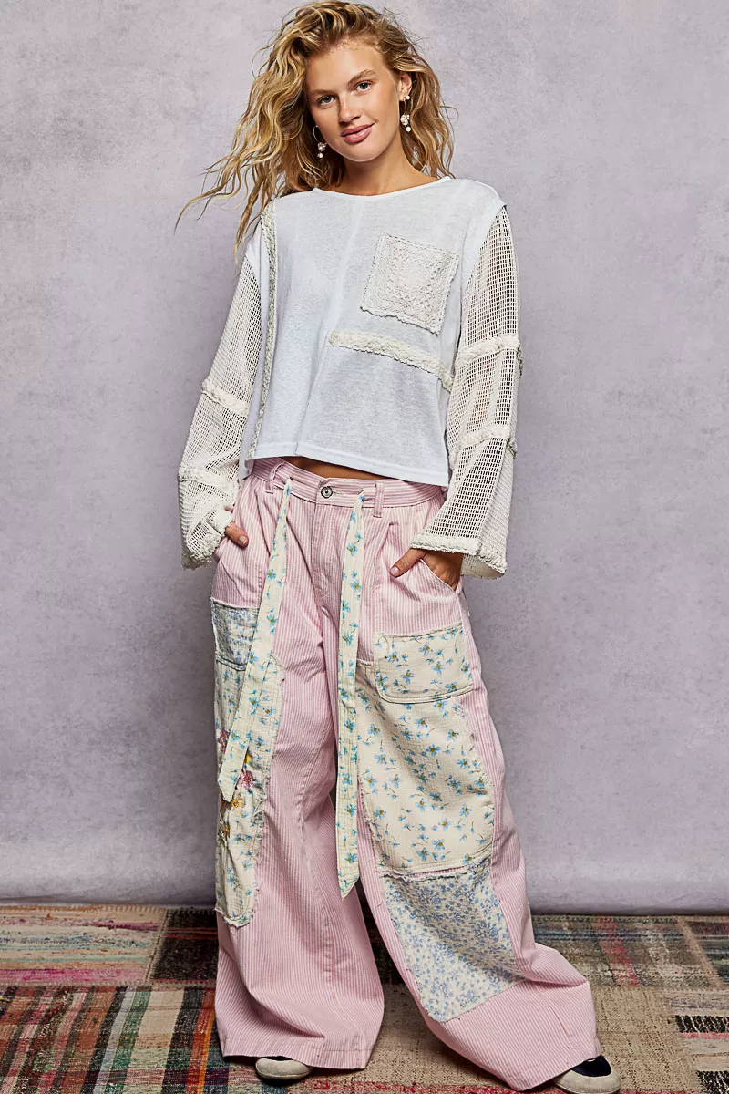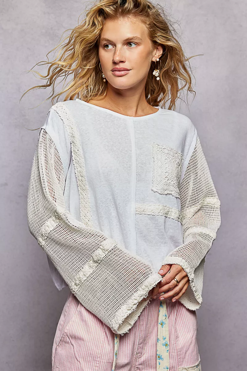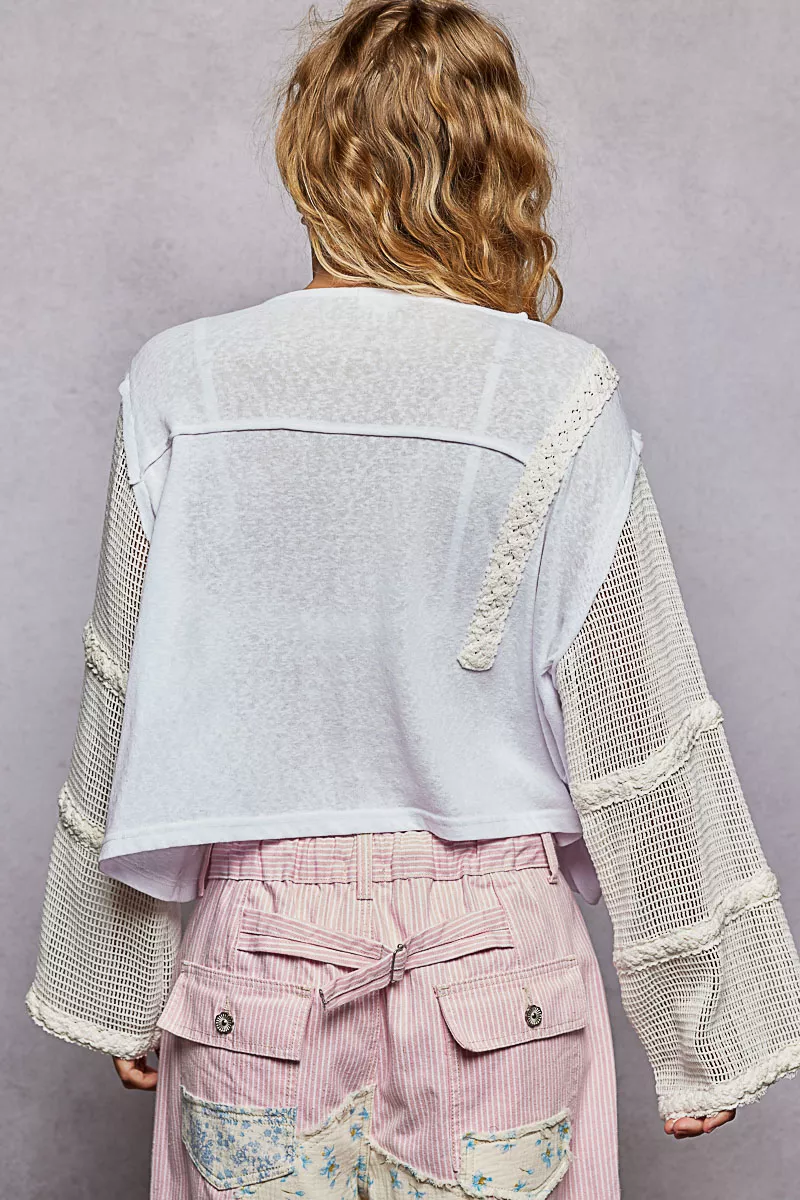 POL Round Neck Washed Top with Crochet See Through Sleeves