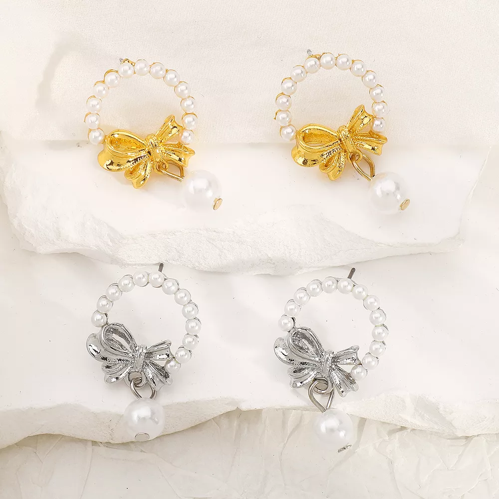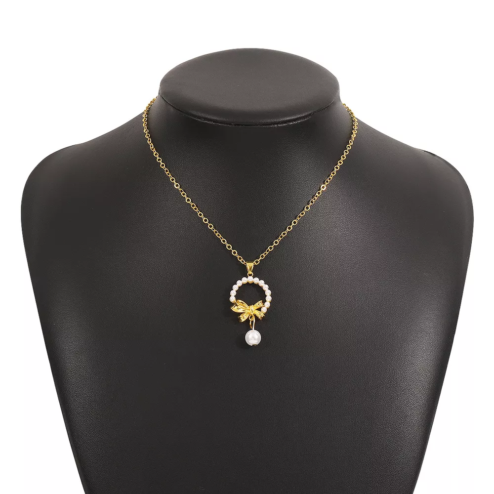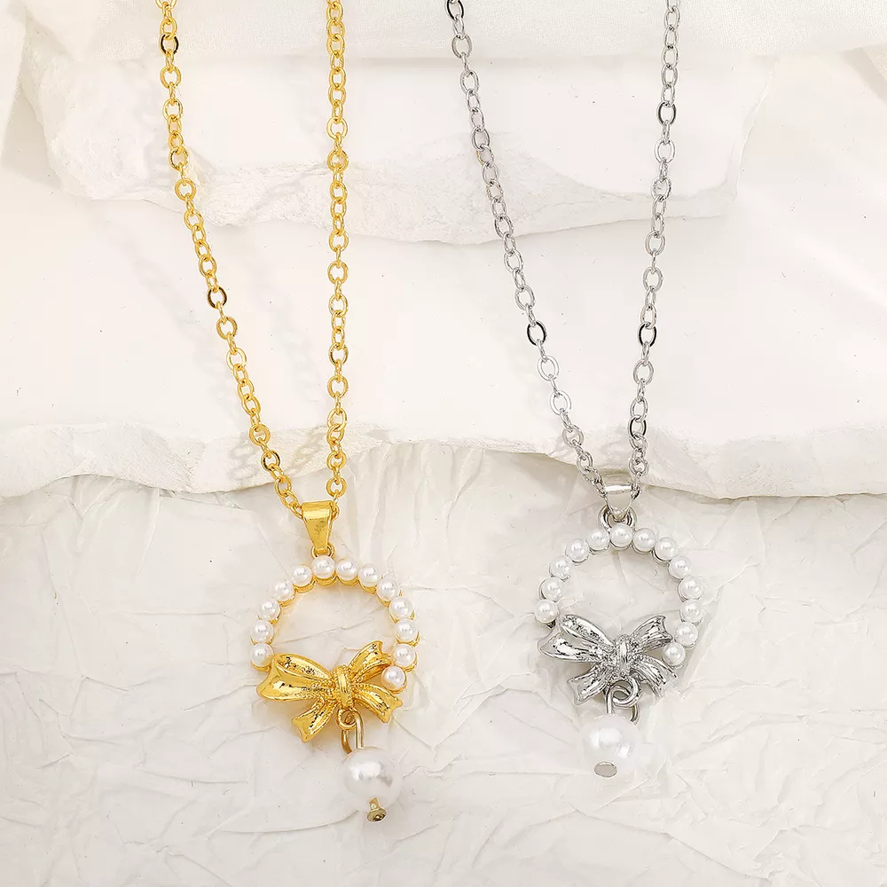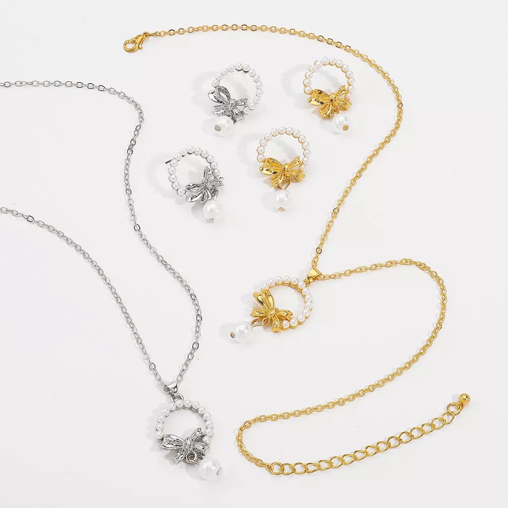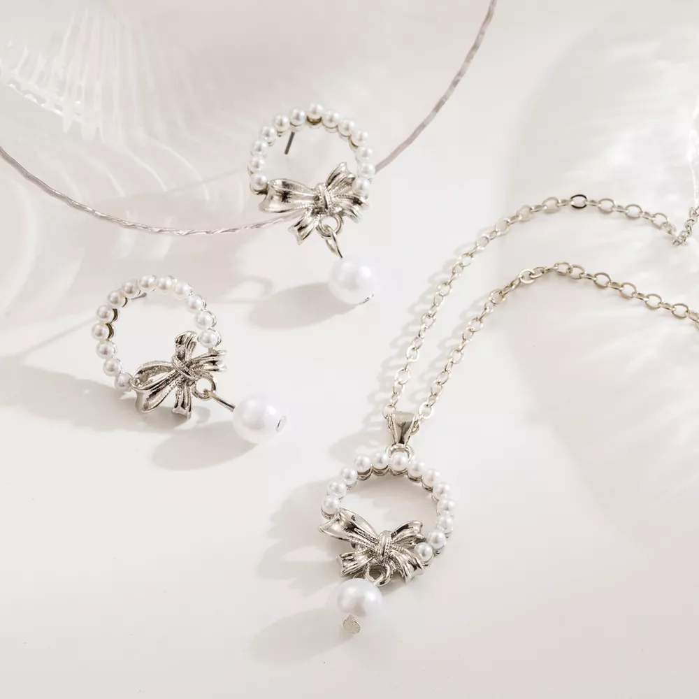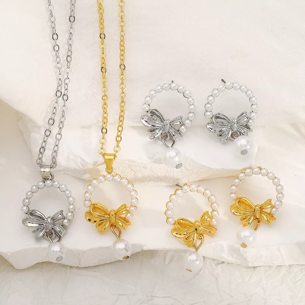 Bowknot Pearl Earrings and Pendant Necklace Jewelry Set