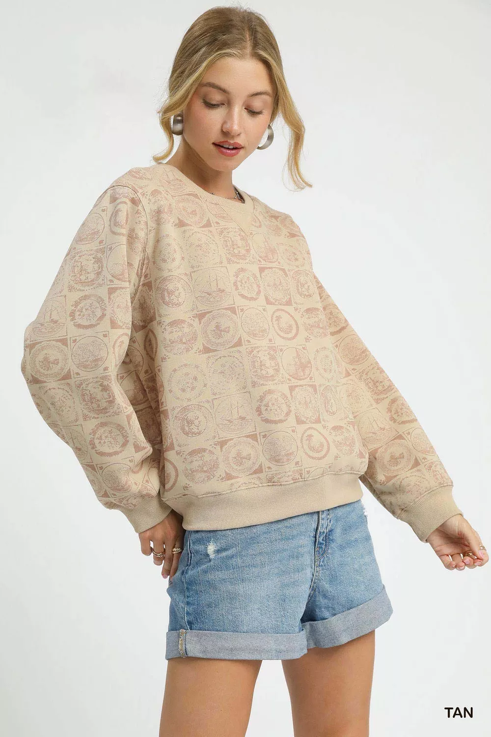 The Coin Stamp Print Sweatshirt features a pullover design with a crew neck and V-stitch detail for a classic look. Its long sleeves come with ribbed cuffs for a comfortable fit. The ribbed bottom hem adds a touch of texture and style to the sweatshirt. This piece does not have a lining, making it ideal for layering over your favorite tops. Elevate your casual wardrobe with this versatile and timeless sweatshirt that combines comfort and style effortlessly.