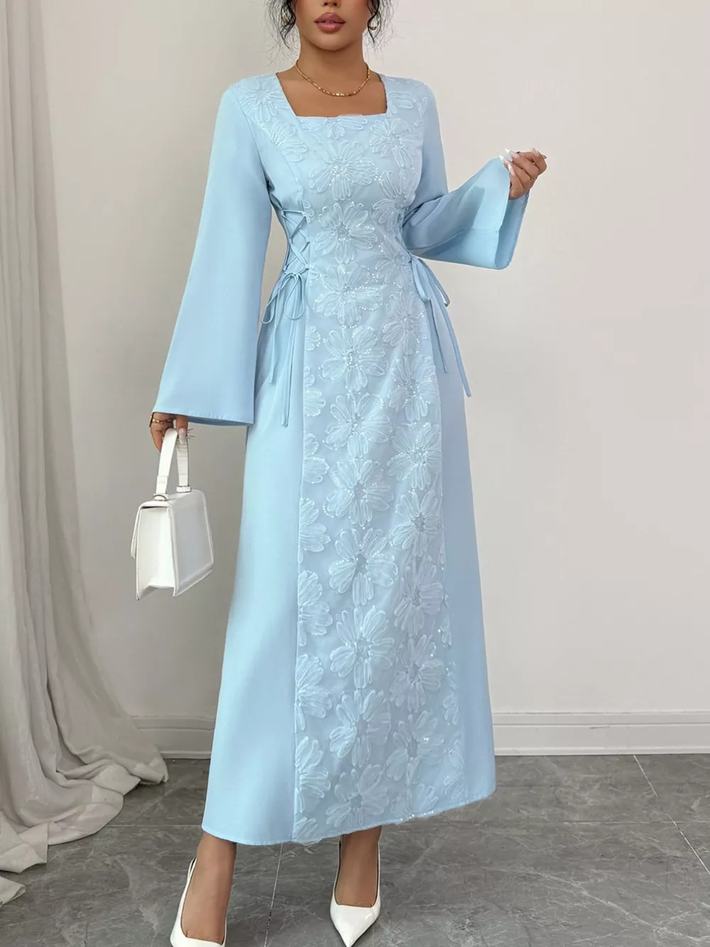 Lace Up Square Neck Long Sleeve Maxi Dress