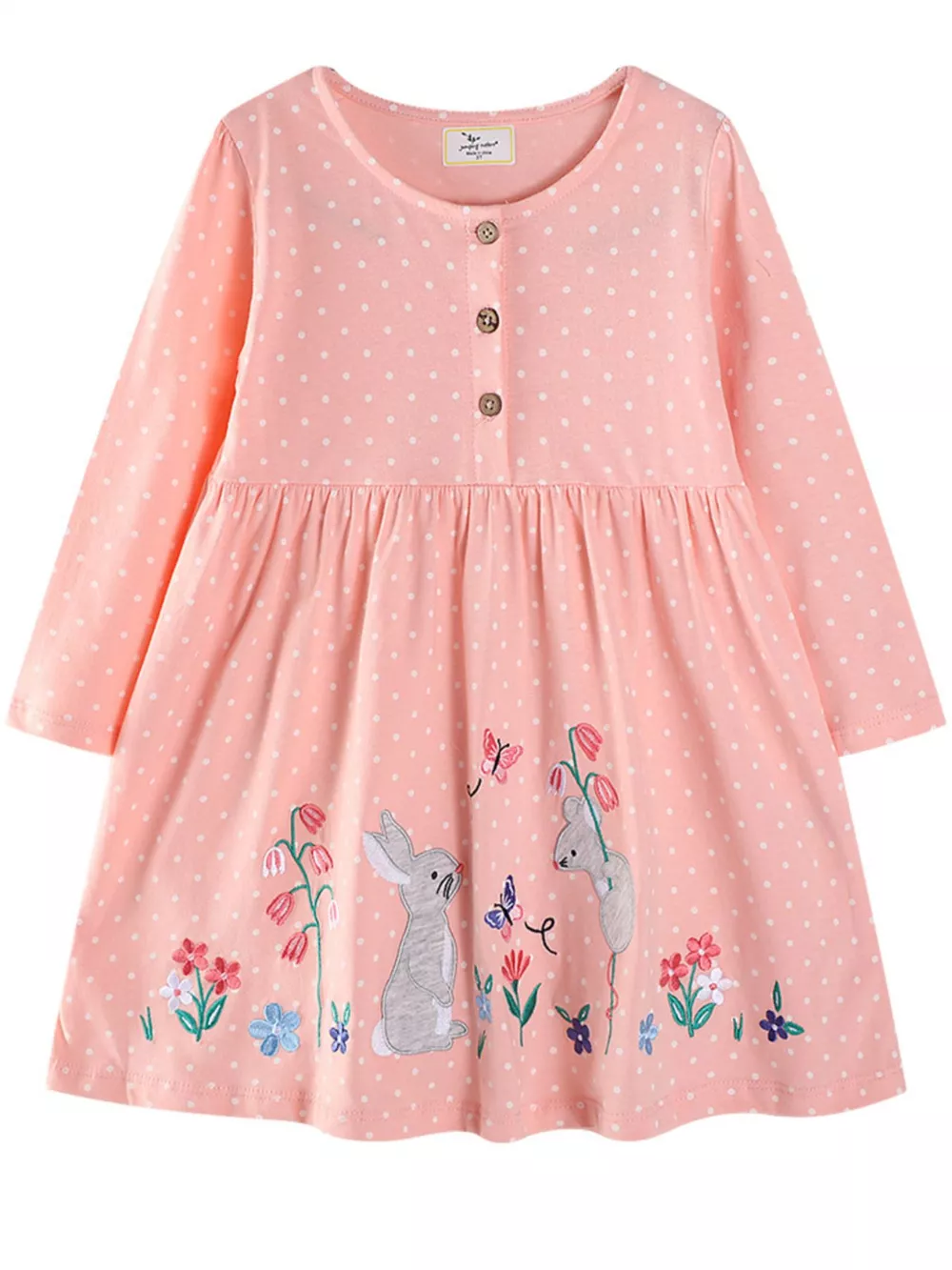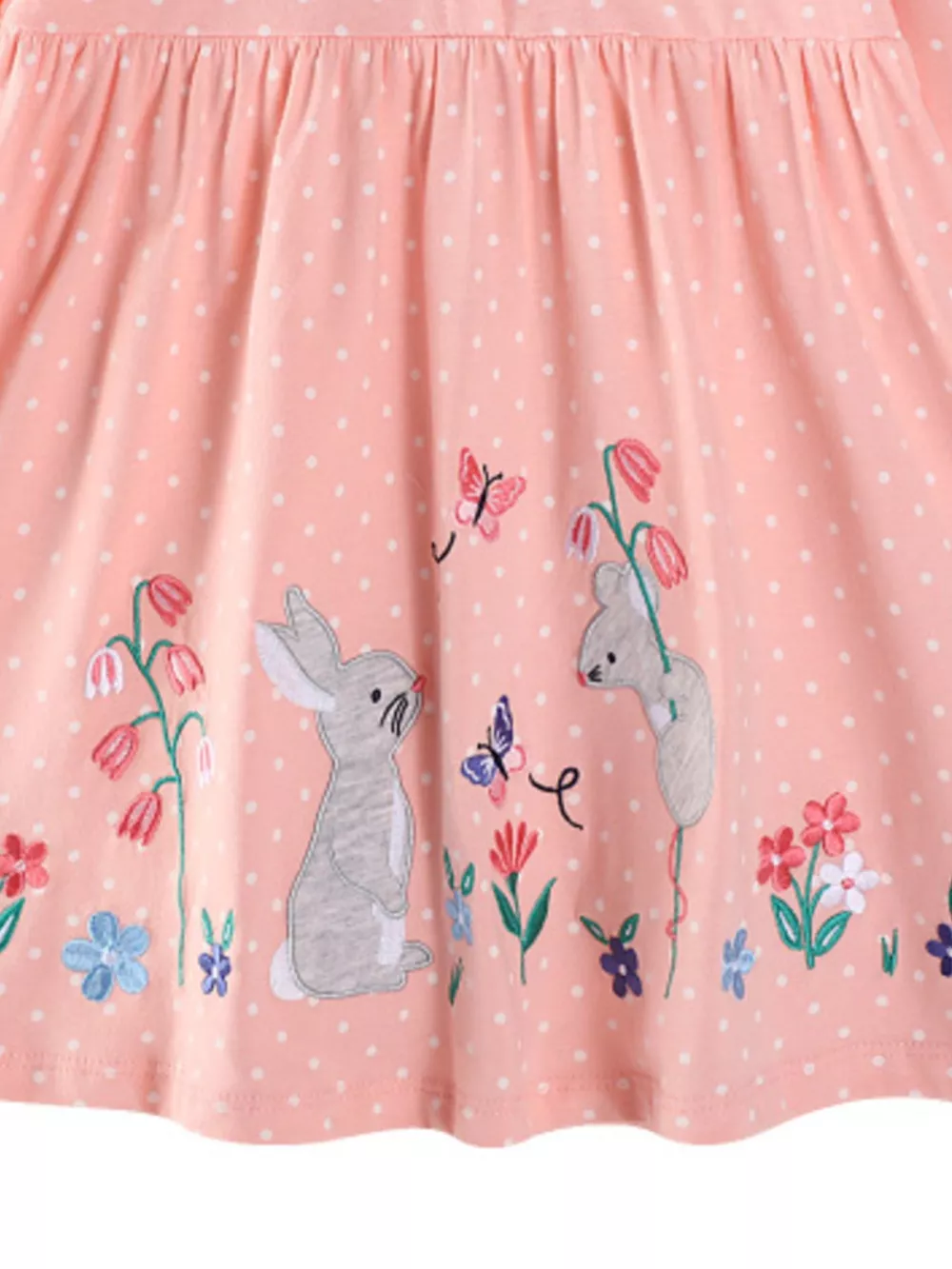 Children's Cute Animal Embroidered Polka Dot Long Sleeve Dress