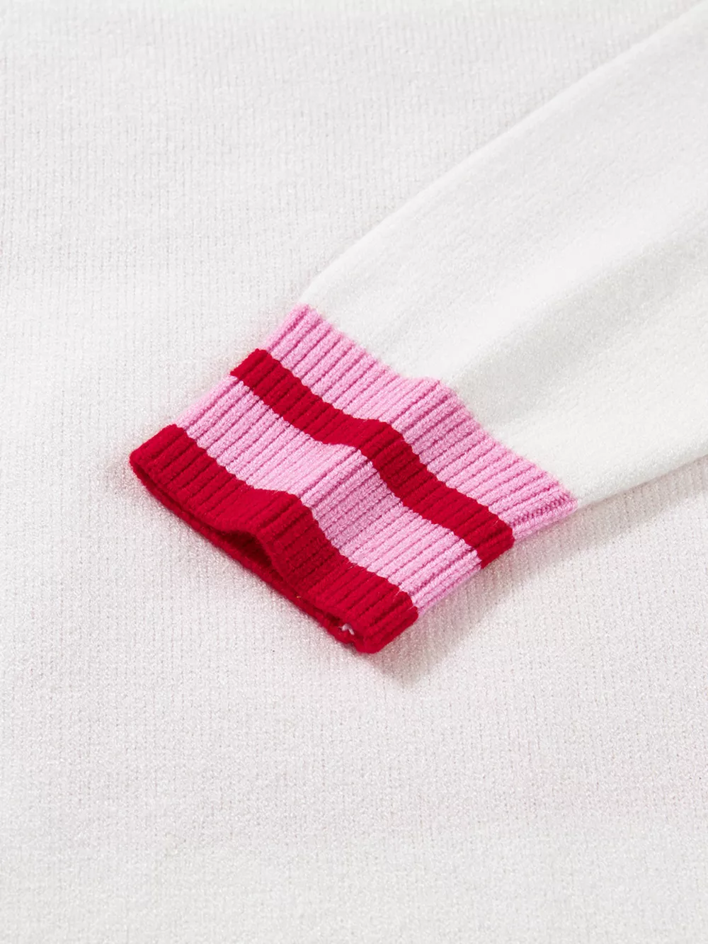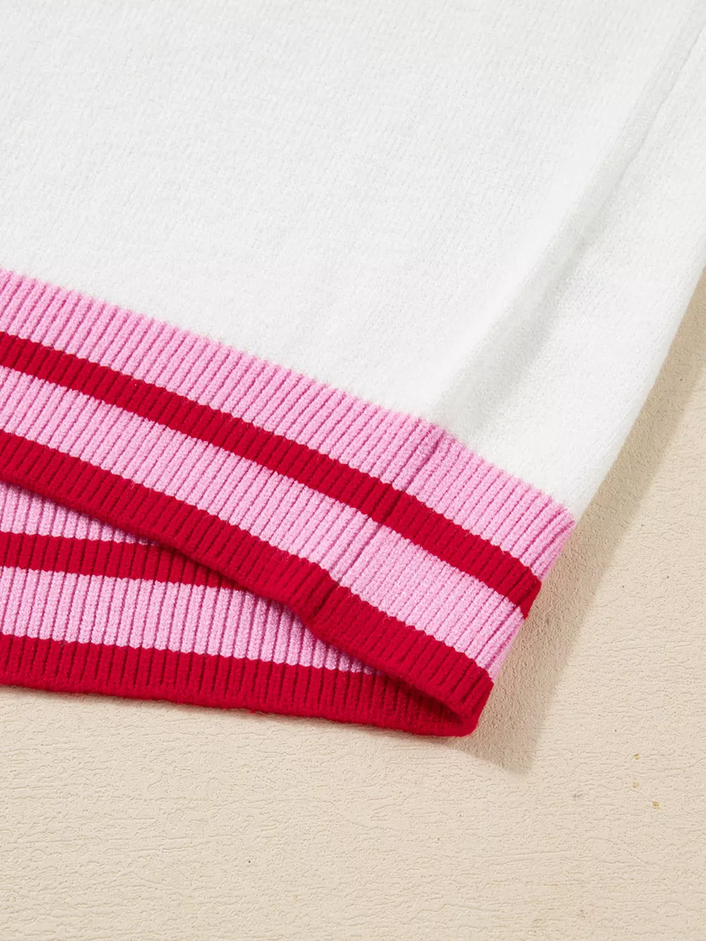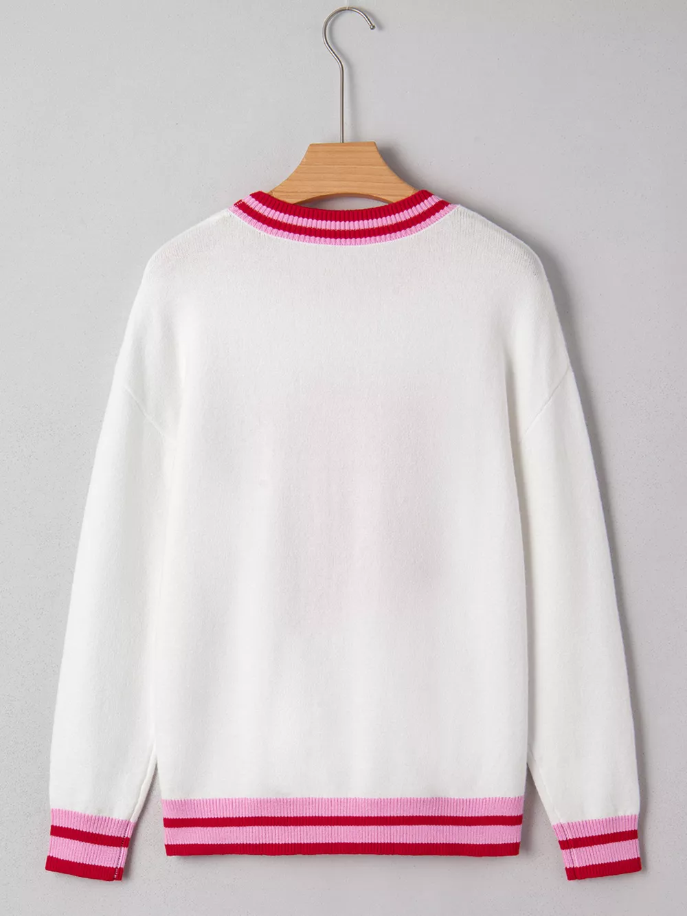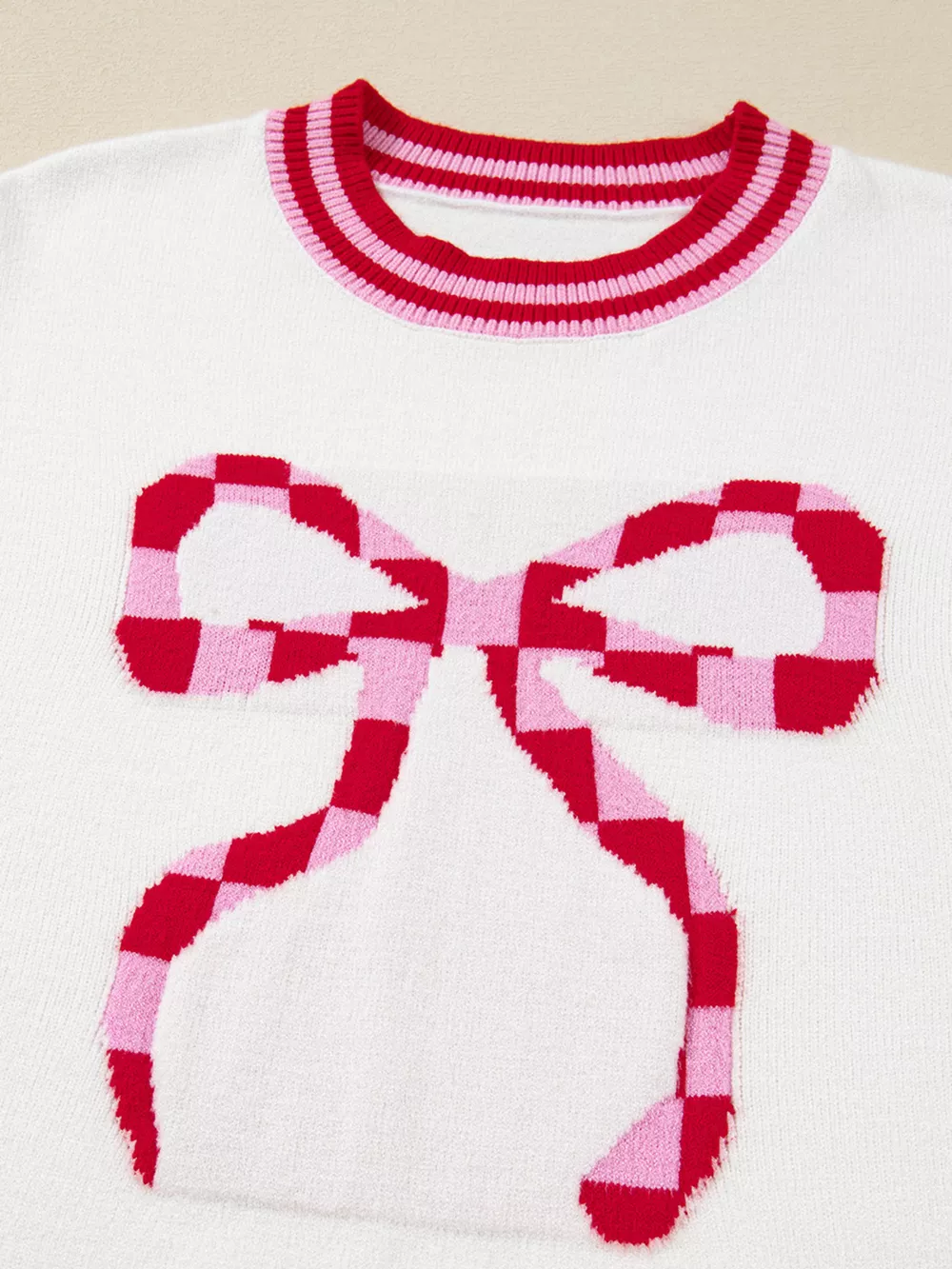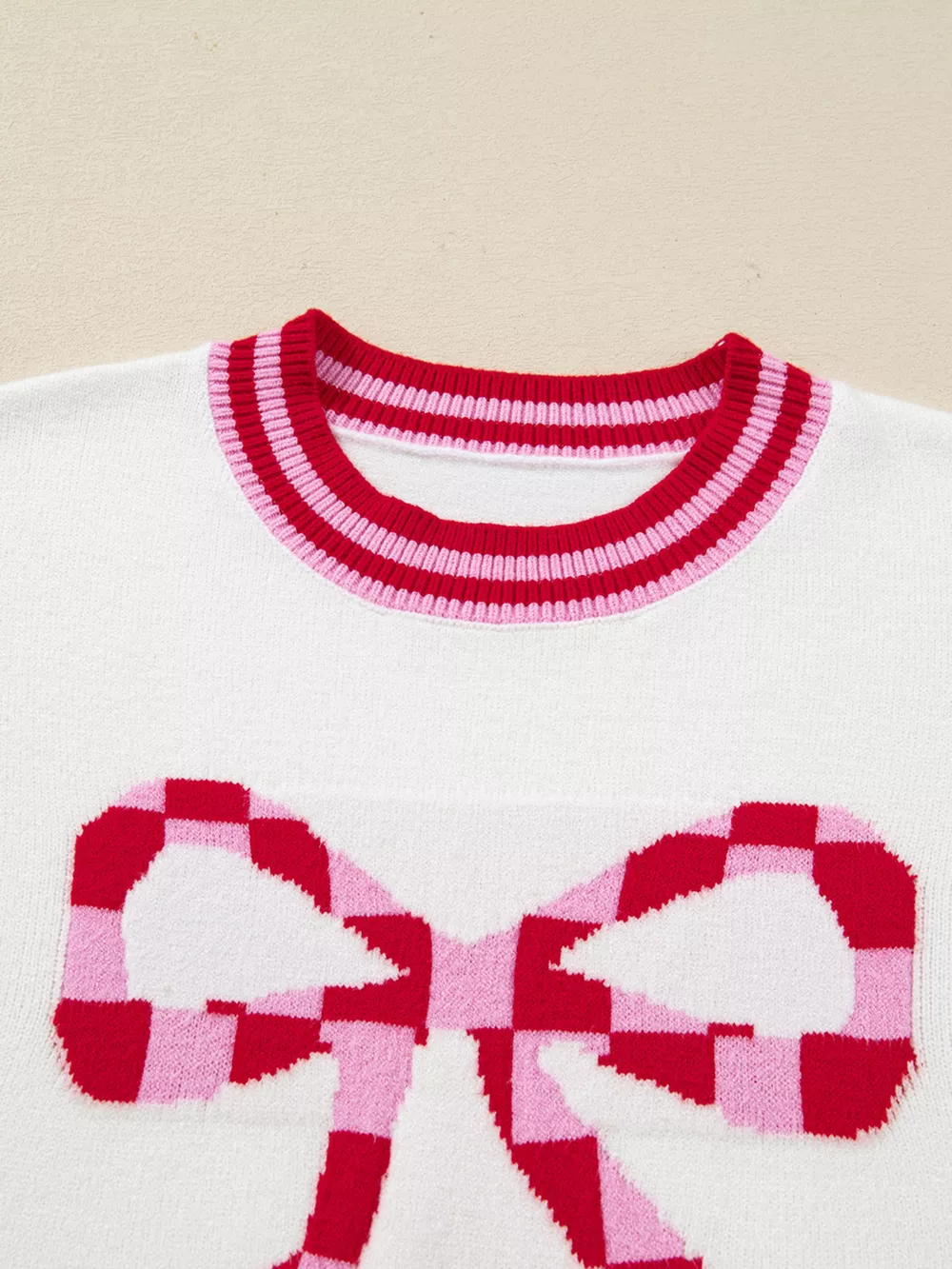 Striped Trim Bow Graphic Round Neck Drop Shoulder Sweater