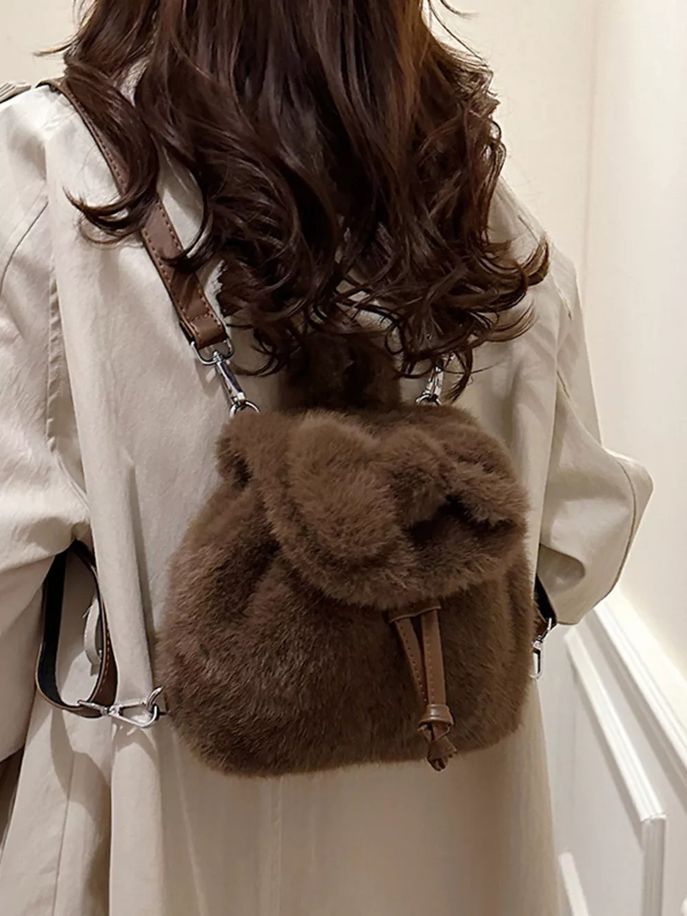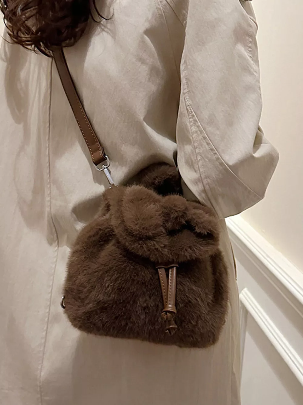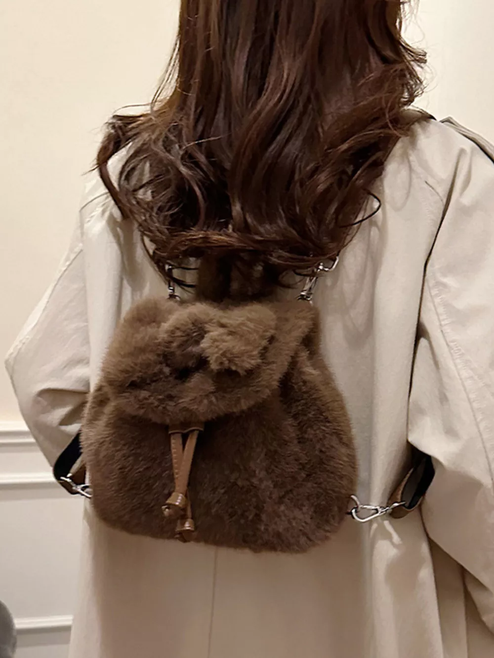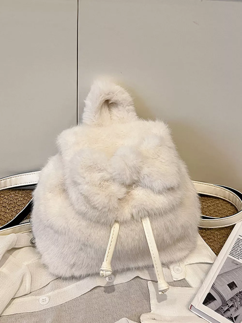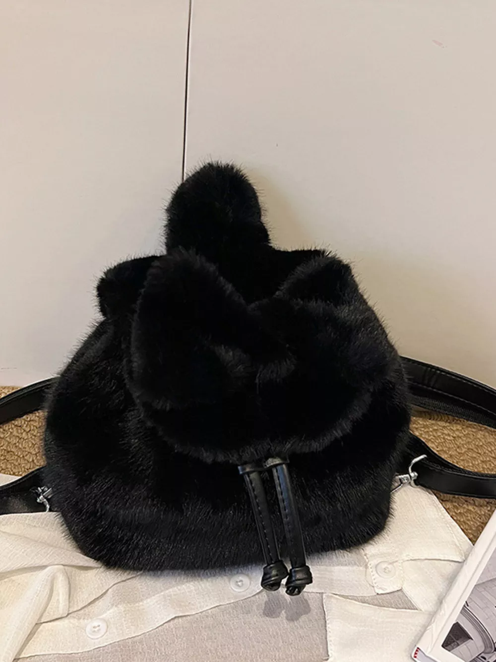 Fuzzy Plush Drawstring Backpack Bag