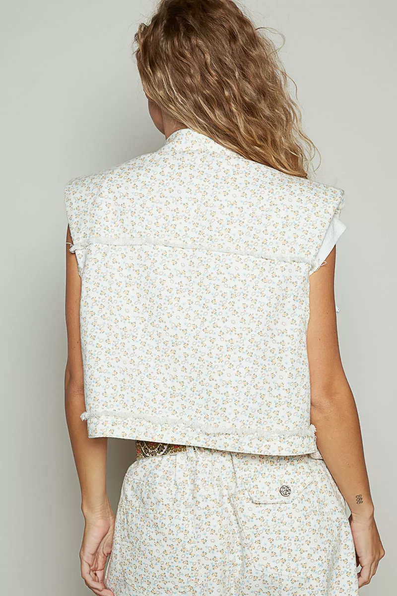 POL Assymetrical Front Closure Raw Hem Floral Denim Vest