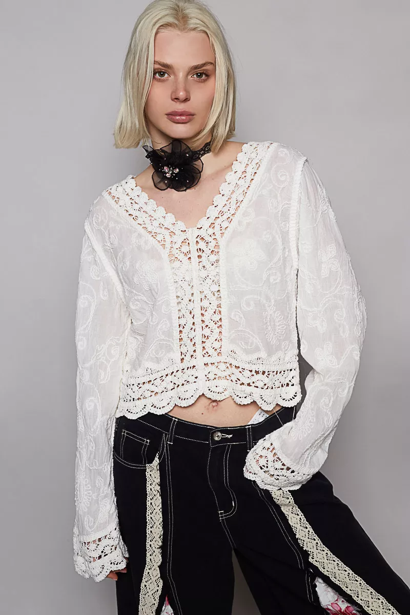 POL Long Sleeve Cropped Crochet Top with Floral Embroidery Detail