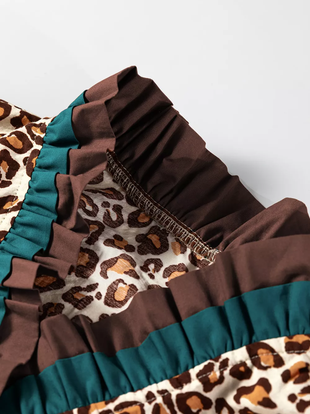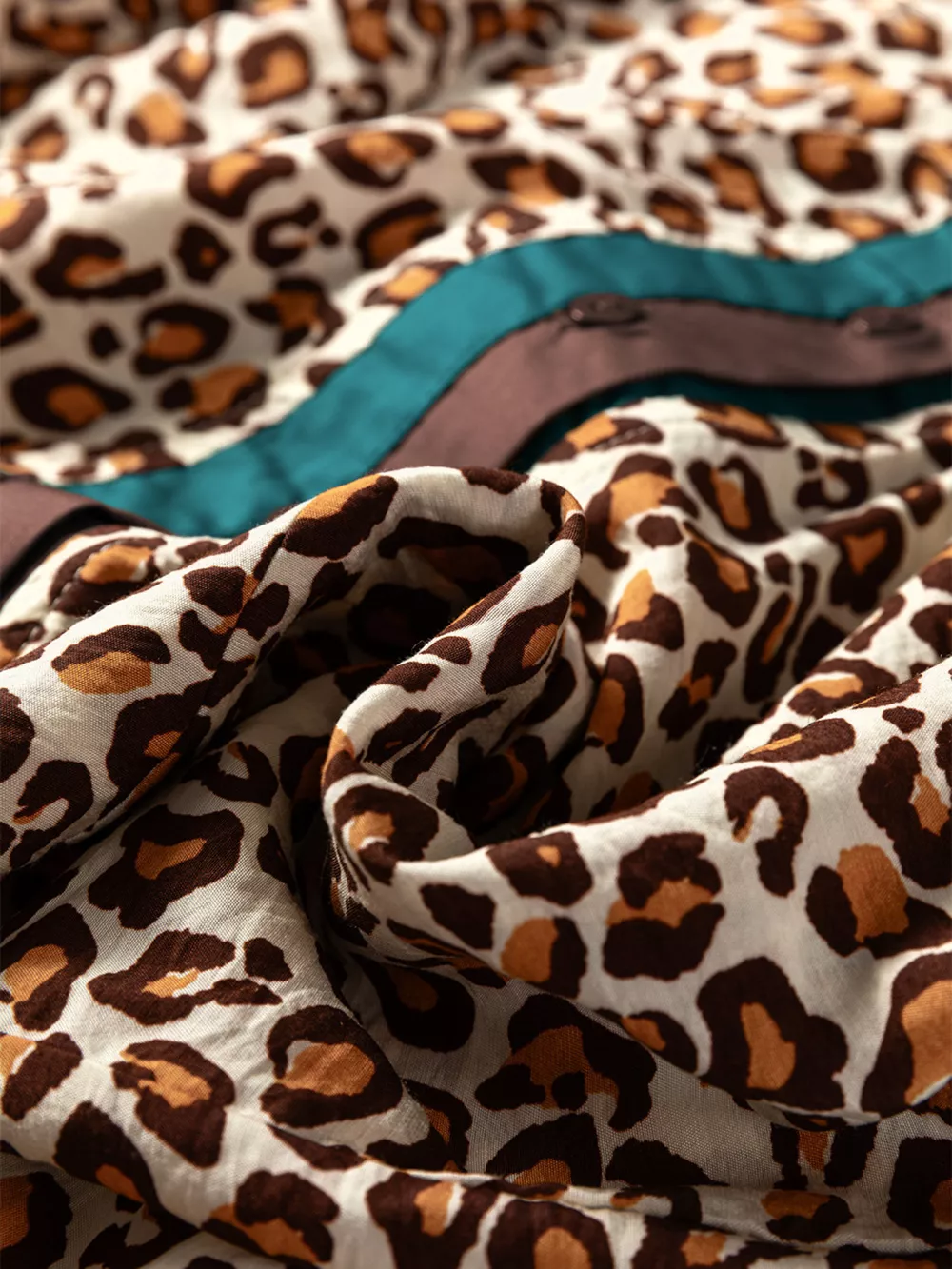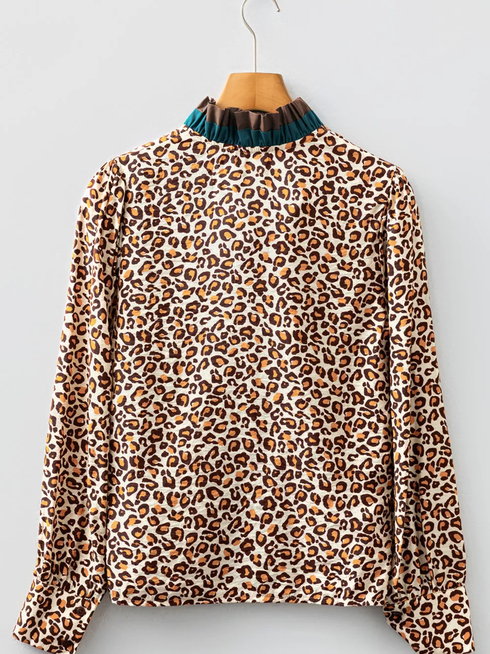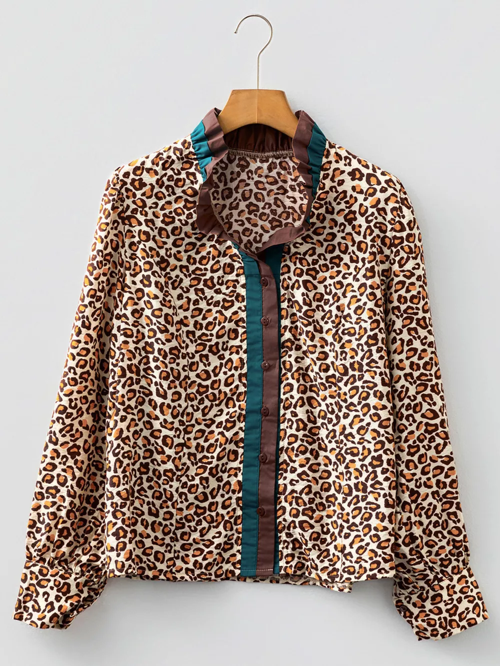 Leopard Print Contrast Frilled Trim Button Down V Neck Shirt