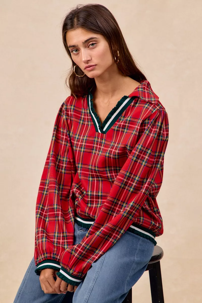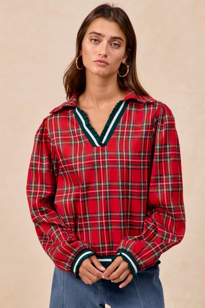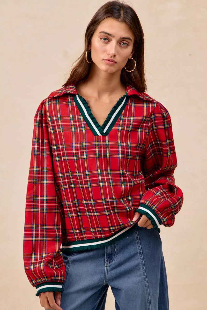 BiBi Christmas Plaid Collared Top with Ruffled Detail