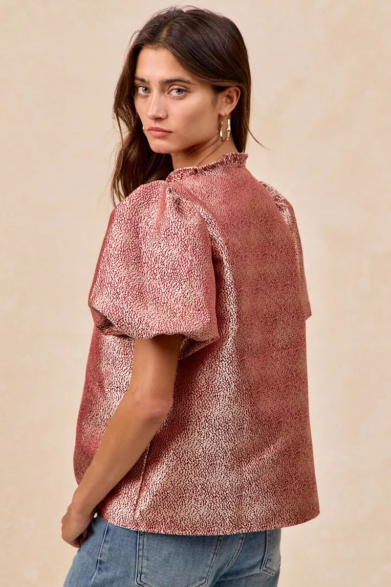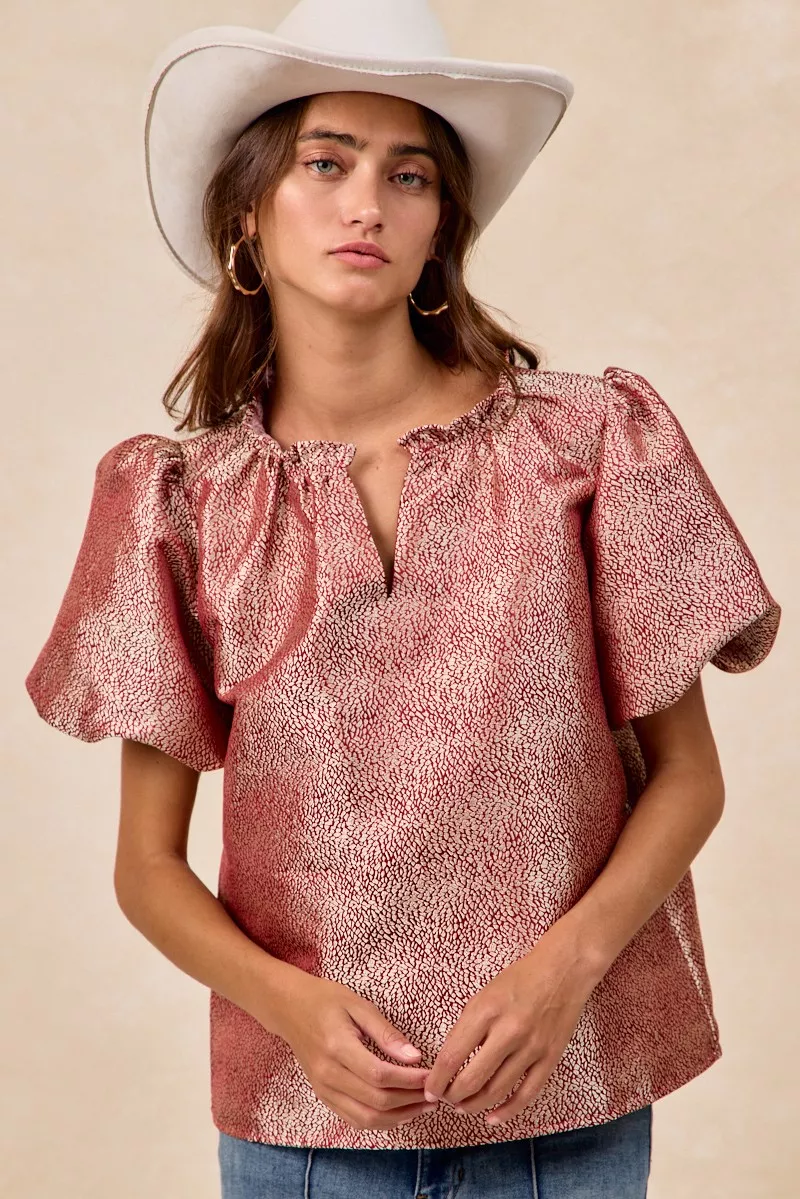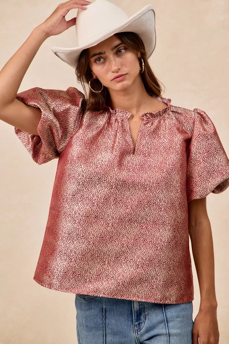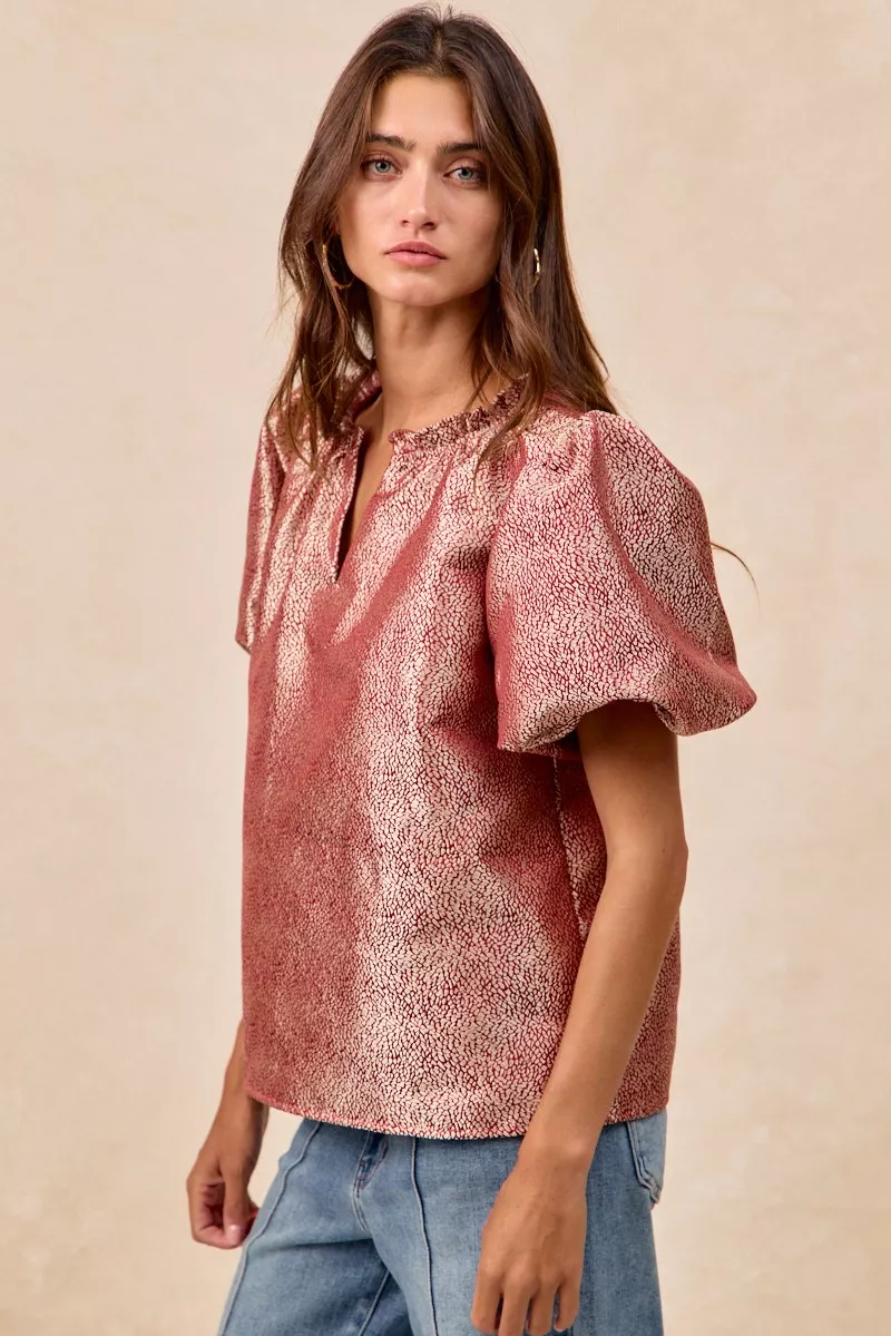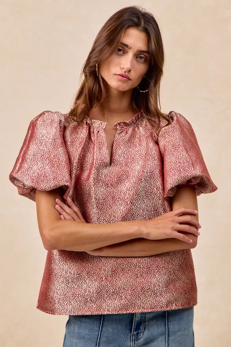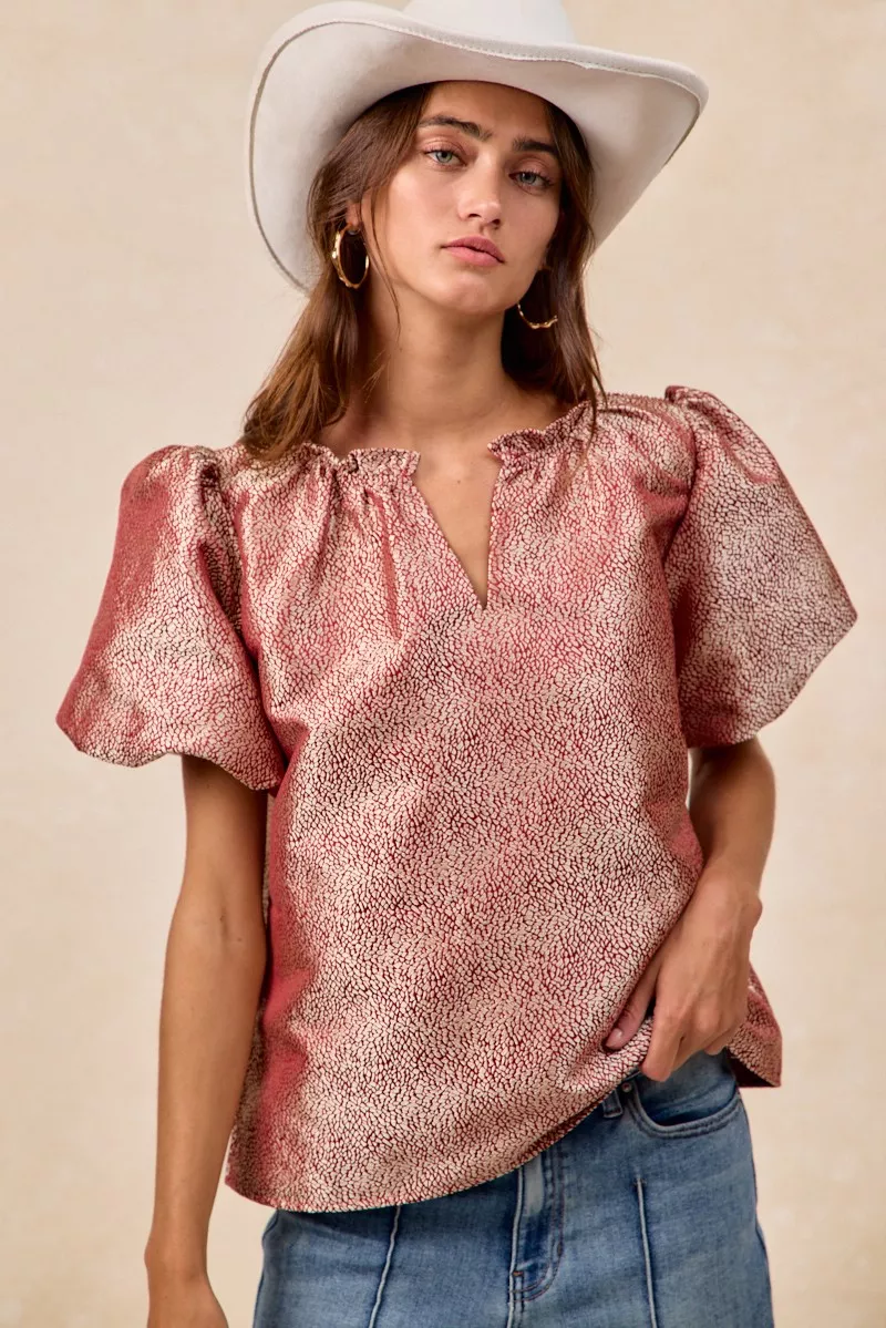 BiBi Jacquard Woven Short Balloon Sleeves V Neck Top