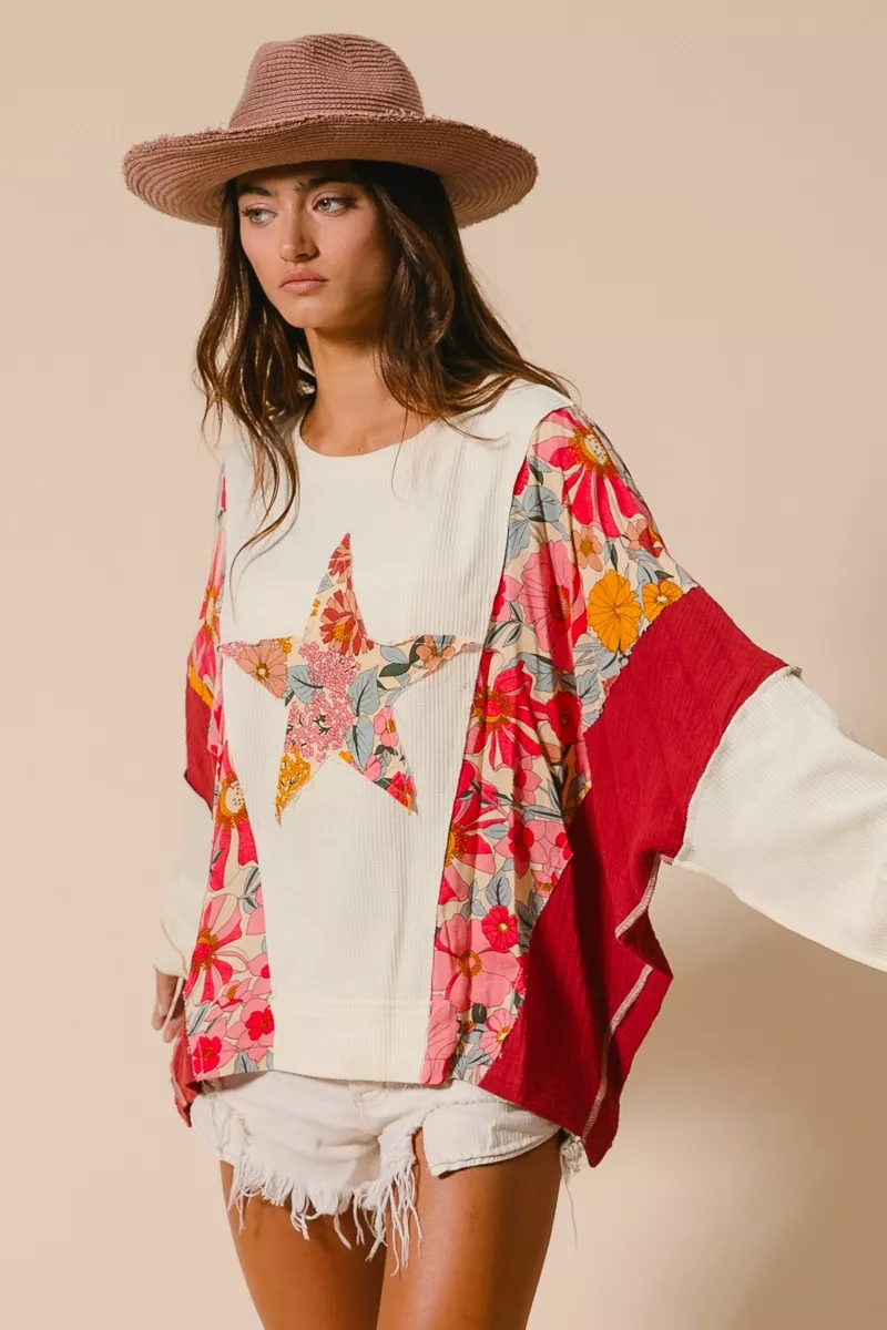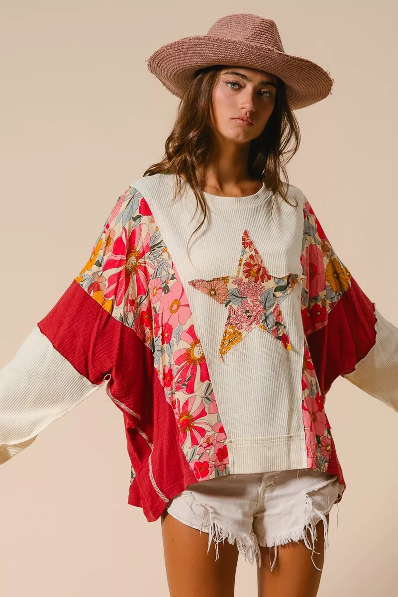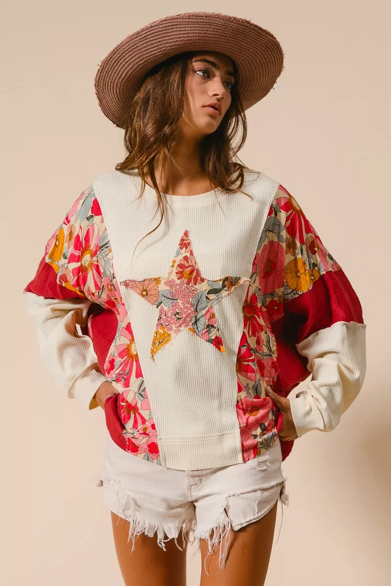 The Knit And Print Mixed And Match Top combines floral print and star patch details for a bold and eclectic look. This round neck sweatshirt offers a unique mix of patterns and textures, perfect for those who love to make a statement with their style. The floral print adds a feminine touch, while the star patch brings a hint of playfulness to the design. Pair this top with your favorite bottoms for a fashion-forward and individualistic outfit. Show off your personality and creativity with this mixed and match sweatshirt that stands out from the crowd.