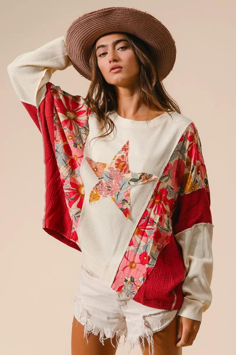 BiBi Floral Print Mixed Star Patch Round Neck Sweatshirt