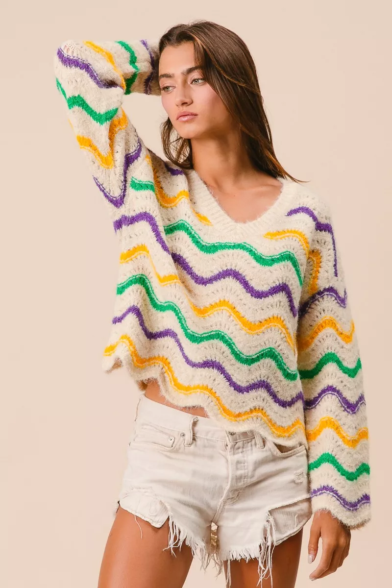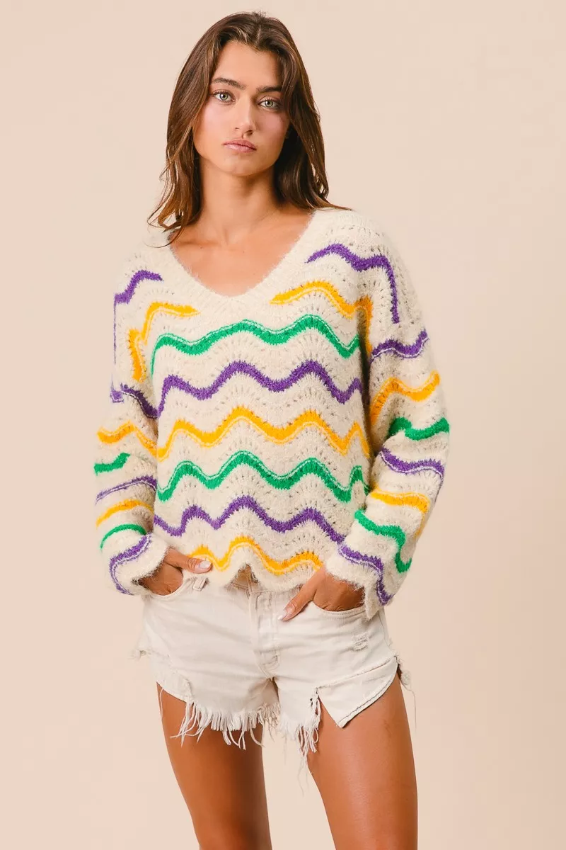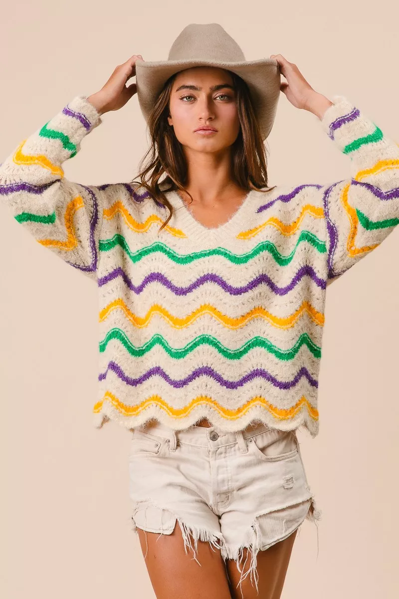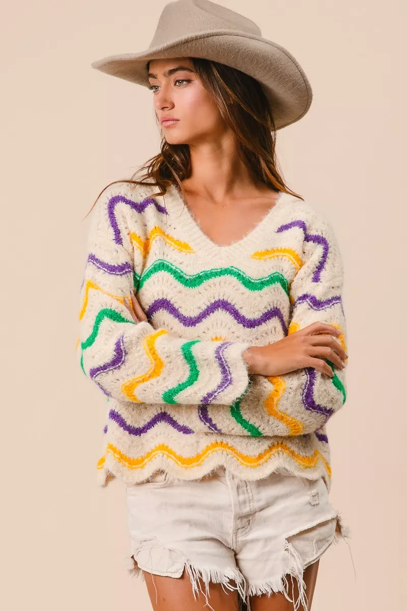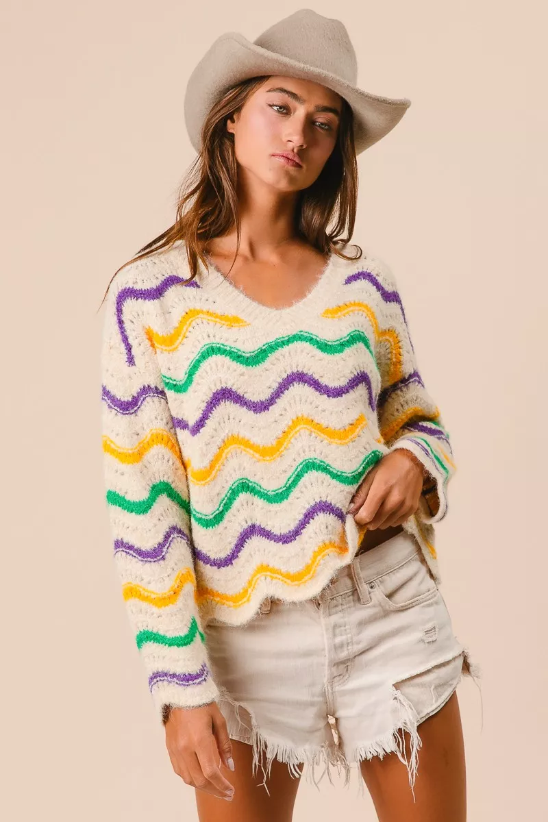 BiBi Mardi Gras Wavy Stripes V-Neck Sweater
