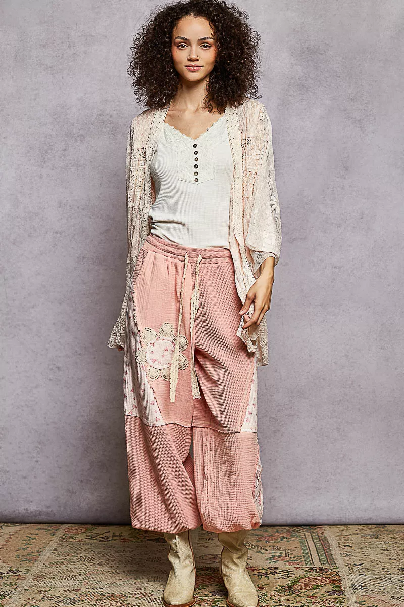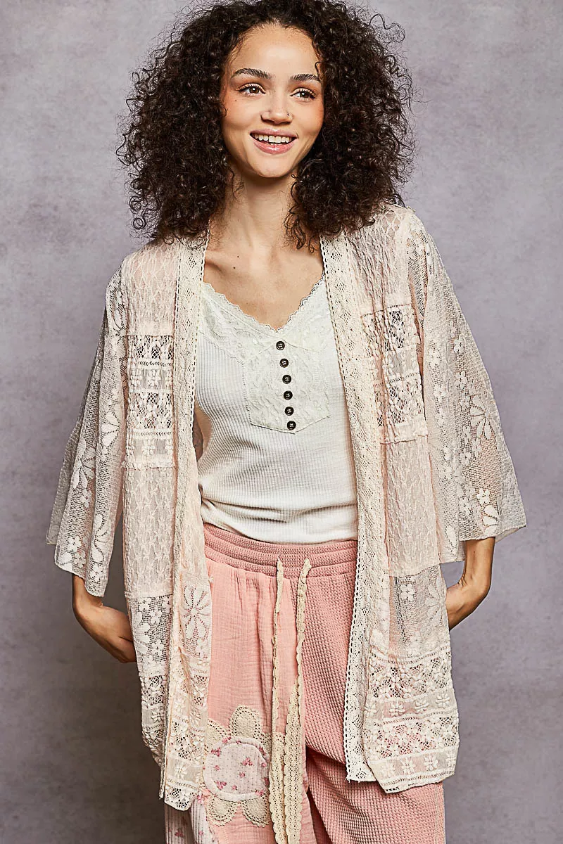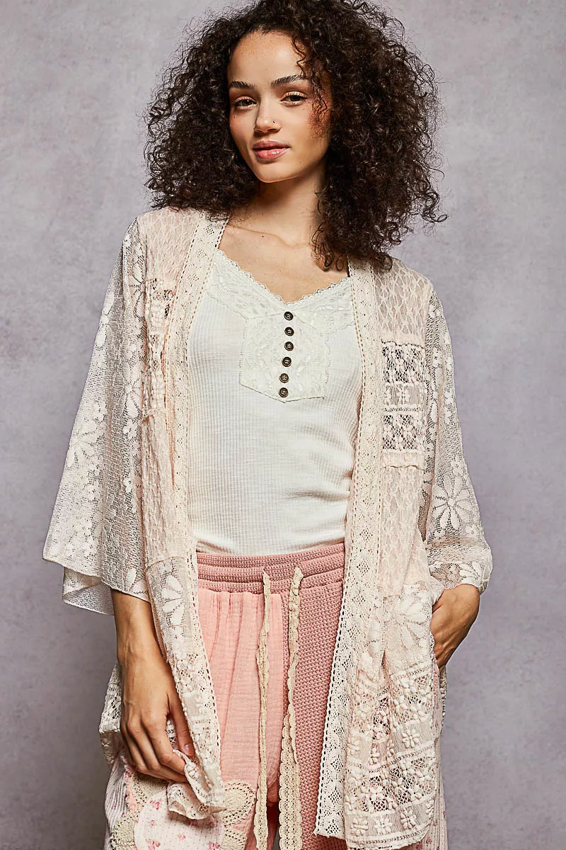 POL Lace Floral Open Front Cardigan with Trim Detail