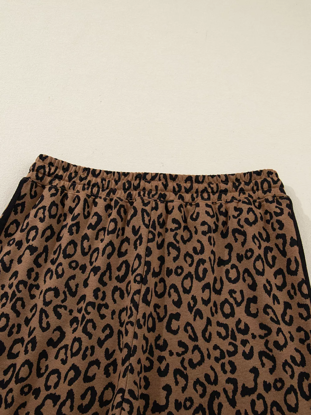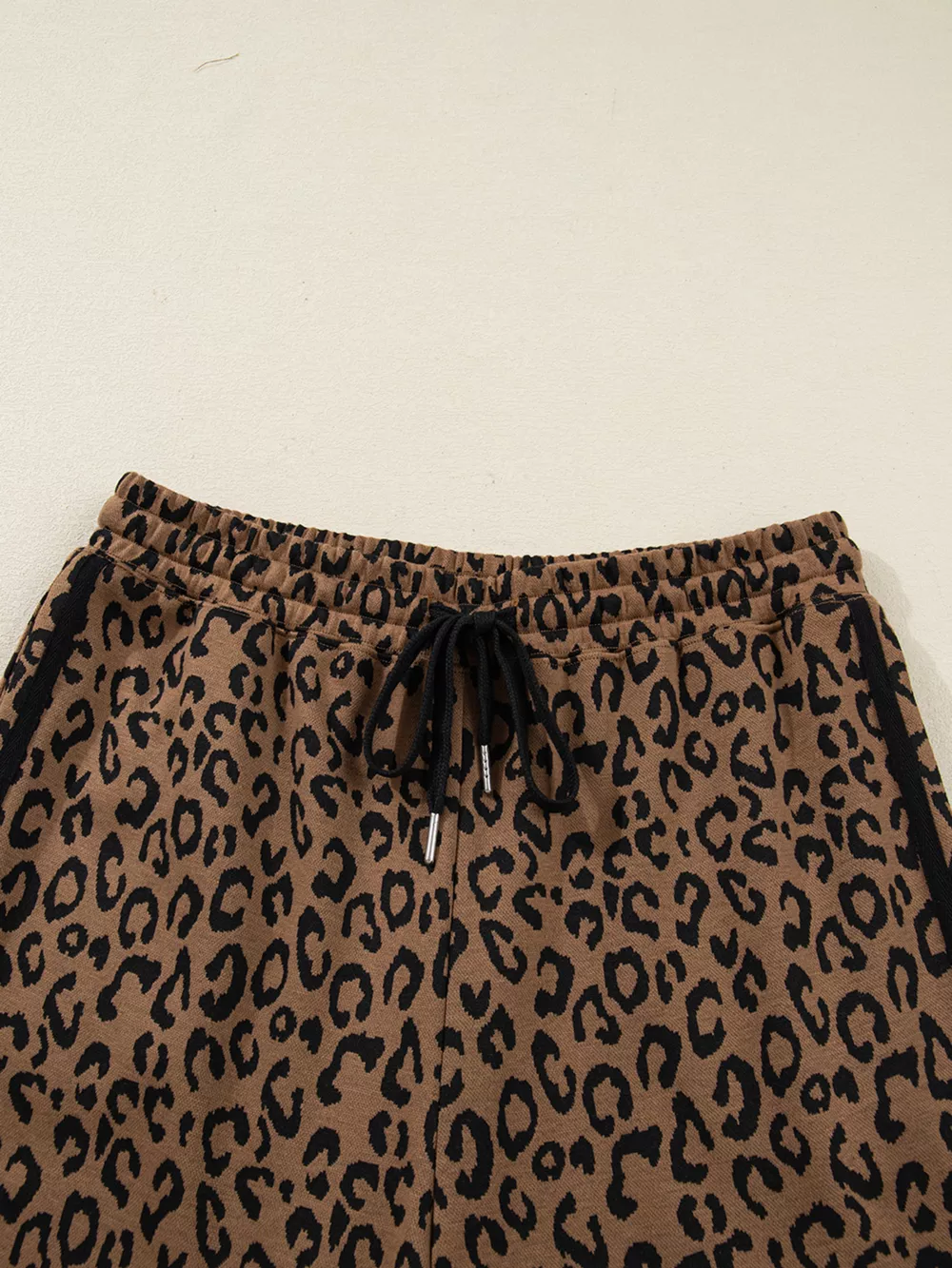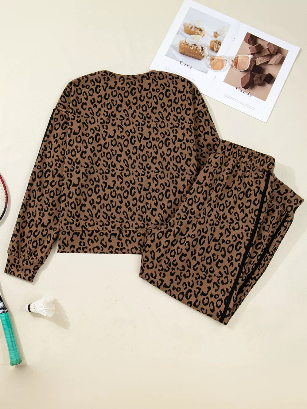 Striped Trim Leopard Long Sleeve Top Drawstring Pant Set