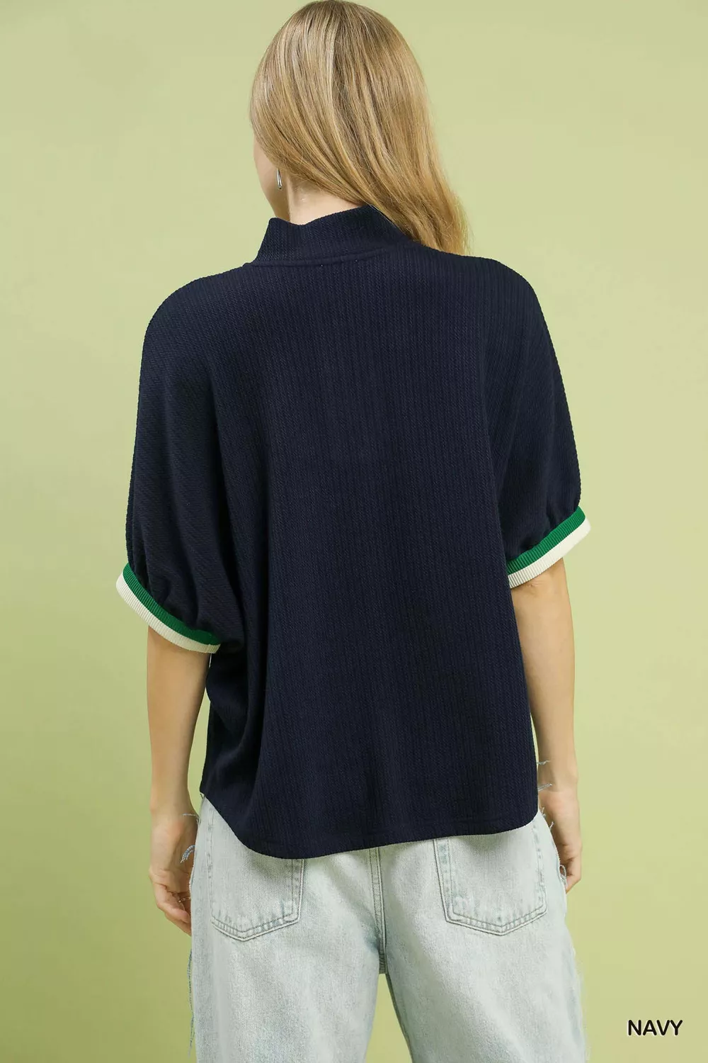 This textured knit top with contrast trim features a split neckline with a striped accent for a chic touch. The short dolman sleeves add a modern and relaxed vibe to the design. With a relaxed, boxy fit, this top offers comfort and style in one. It is not lined, making it lightweight and breathable for everyday wear. Perfect for adding a pop of style to your casual wardrobe.