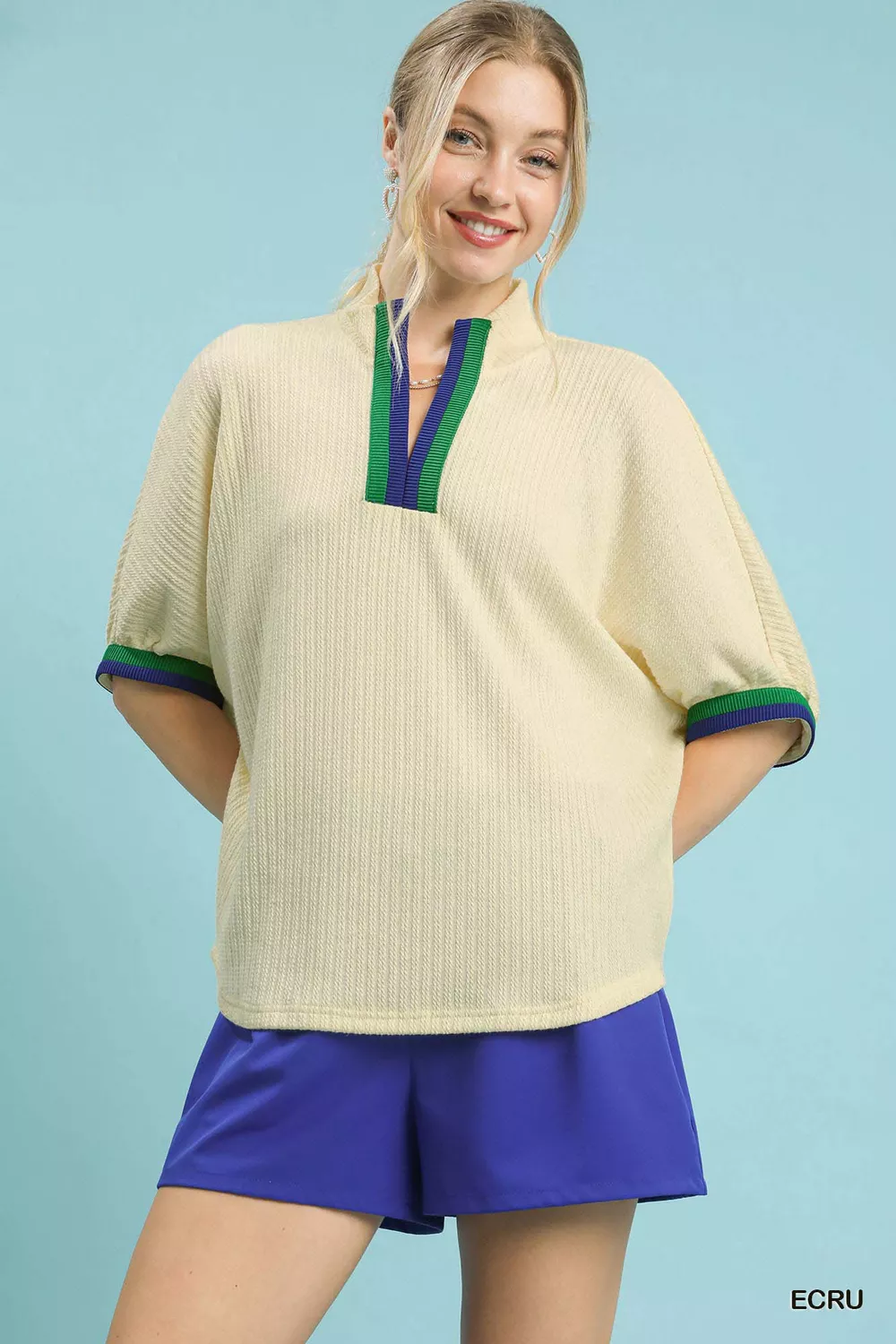 This textured knit top with contrast trim features a split neckline with a striped accent for a chic touch. The short dolman sleeves add a modern and relaxed vibe to the design. With a relaxed, boxy fit, this top offers comfort and style in one. It is not lined, making it lightweight and breathable for everyday wear. Perfect for adding a pop of style to your casual wardrobe.