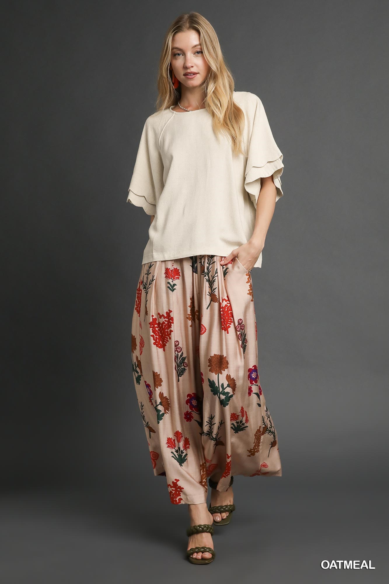 This boho top is made of linen and features a round neckline with scallop edge detail. The double flutter sleeves add a feminine touch to the design. It is not lined, making it perfect for warm weather. The scallop sleeve detail gives it a unique and stylish look. Perfect for adding a touch of bohemian flair to your wardrobe.