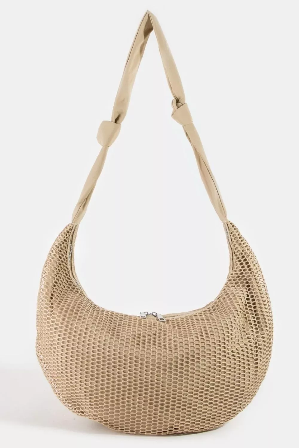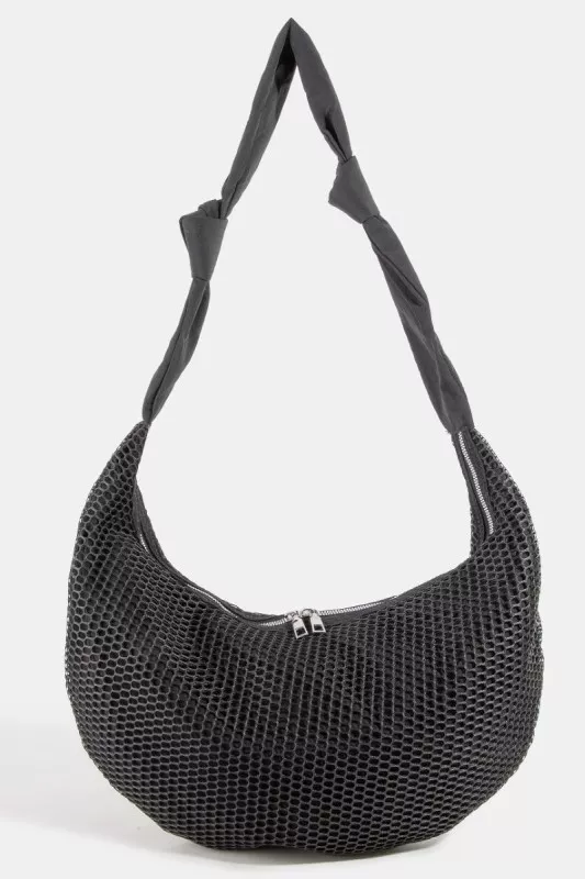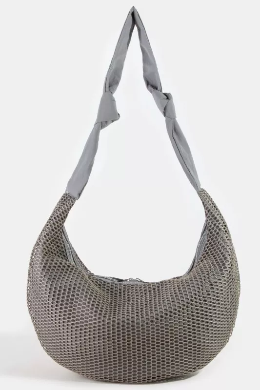 This shoulder bag features a textured mesh design that adds a trendy and modern touch to the accessory. The knot shoulder strap detail adds a unique and stylish element to the bag. Perfect for adding a fashion-forward flair to your outfit, this bag is both functional and fashionable. The textured mesh material gives it an edgy and contemporary look. Elevate your accessories collection with this eye-catching textured mesh knot shoulder bag.