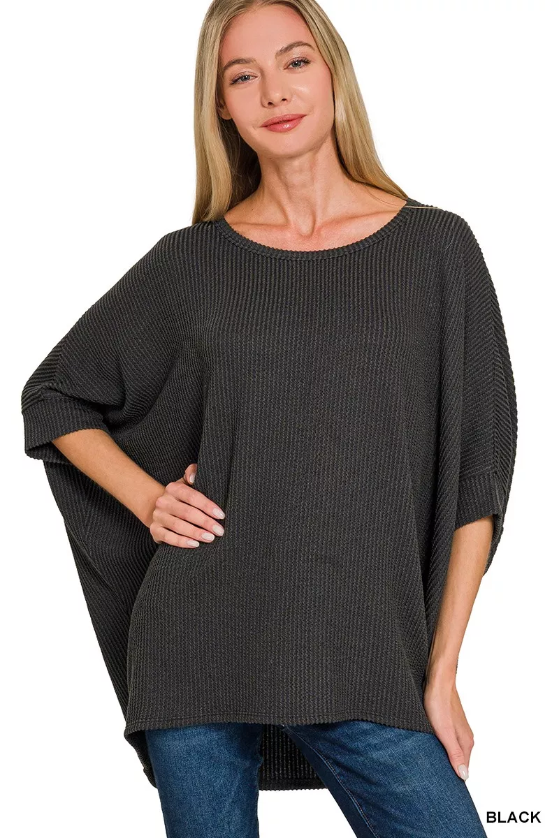 Add a touch of sophistication to your look with the classic and versatile black raised rib bat sleeve top. The raised rib texture elevates the design, creating a modern and chic silhouette. The bat sleeves provide a relaxed and effortless fit, perfect for any occasion. Pair this top with your favorite bottoms for a timeless and stylish outfit that never goes out of style. Stay on-trend with this elegant black top, perfect for adding a touch of luxury to your wardrobe.